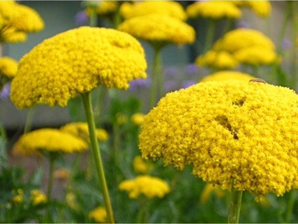 Farnblättrige Schafgarbe 'Cloth of Gold' - eine robuste Staude mit kräftigem Wuchs und langer Blütezeit. Sie erreicht eine Höhe von 120 cm, ausnahmsweise bis zu 170 cm, und eine Breite von 60–80 cm, wodurch sie ein markantes architektonisches Element in Beeten bildet. Die Blätter sind hellgrün, fiederschnittig, stark aromatisch und tragen auch außerhalb der Blütezeit zur dekorativen Wirkung bei. Die Blüten sind leuchtend gelb, in flachen Blütenständen von etwa 14 cm Durchmesser angeordnet, erscheinen von Juli bis September und ziehen Bestäuber, insbesondere Bienen und Schmetterlinge, an. Starke, aufrechte Stiele tragen die Blütenstände und sorgen dafür, dass die Pflanze im Hintergrund von gemischten Staudenbeeten gut zur Geltung kommt. Sie ist anspruchslos, frosthart und widerstandsfähig. Die Blütenstände eignen sich auch zum Trocknen und zur Verwendung in Trockenbindereien, was ihren Gebrauchswert erhöht. Dieser Kultivar eignet sich für Gruppenpflanzungen, für Solitärpflanzungen sowie für Kombinationen mit Ziergräsern und anderen Sommerstauden.