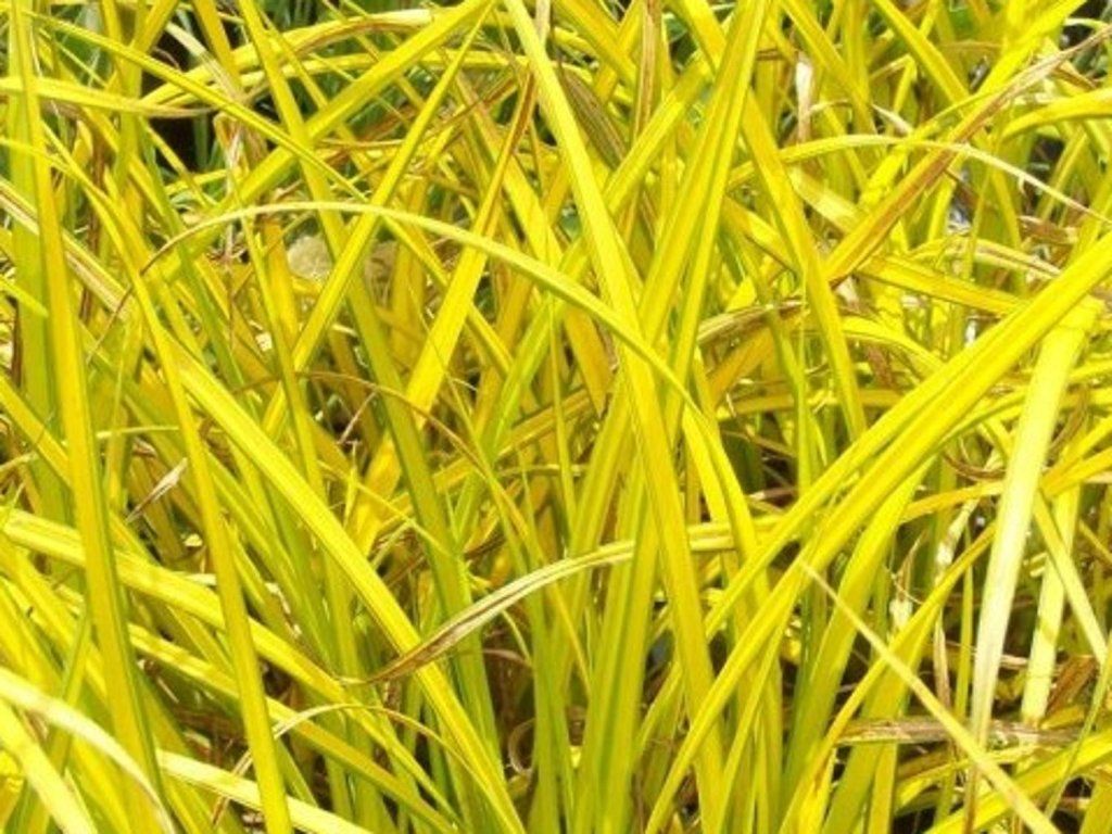 Segge 'Aurea' - bemerkenswerte, goldene Segge. Dies ist ein sehr auffälliges Ziergras mit leuchtend gelben, flachen Blättern, die grün gesäumt sind und feine Bögen bilden. Erreicht eine Höhe von 0,3-0,6m und eine Breite von 0,6-0,9m.