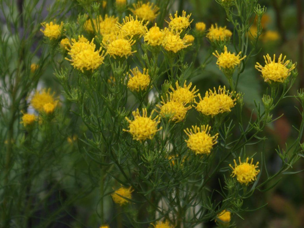 Goldhaar-Aster (Galatella linosyris) - eine anmutige und sehr widerstandsfähige Zierstaude, die ursprünglich aus Europa stammt, wo sie natürlich auf trockenen Steppen, felsigen Hängen und sonnigen Kalkstandorten wächst. Sie wird vor allem für ihre ungewöhnliche gelbe Blüte, ihren aufrechten schlanken Wuchs und ihre außergewöhnliche Trockenheitstoleranz geschätzt. Sie wächst als mittelgroße, feste, horstbildende Staude, normalerweise 40 bis 70 cm hoch. Der Habitus ist aufrecht, schmal und elegant, die Pflanze wirkt nicht ausladend und behält auch ohne Stütze gut ihre Form. Die Blätter sind schmal, linealisch, dunkelgrün, erinnern an Nadeln oder Gras und verleihen der Pflanze einen leichten Steppencharakter. Die Blüten erscheinen von August bis September, manchmal bis Oktober. Sie sind klein, leuchtend gelb, in reichen Rispen an den Stielenden angeordnet. Im Gegensatz zu den meisten Astern haben die Blüten sehr kurze oder fast fehlende Zungenblütenblätter, sodass sie eher wie kleiner gelber „Flaum“ oder Borsten wirken, daher der deutsche Name Goldhaar. Die Blüten sind sehr attraktiv für Bienen, Hummeln und andere Bestäuber im späten Teil der Saison. Sie ist voll frosthart, verträgt Trockenheit, Hitze und Wind ausgezeichnet und leidet nicht unter Krankheiten oder Schädlingen. Sie findet Anwendung in natürlichen, Steppen- und trockenheitsliebenden Pflanzungen, in Schotterbeeten, an Hängen, in Staudenbeeten und in modernen minimalistischen Gärten. Sie lässt sich sehr gut mit Ziergräsern, Fetthennen, Salbei, Sonnenhut und anderen trockenheitsliebenden Stauden kombinieren.