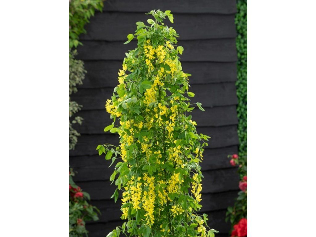 Goldregen 'Yellow Rocket' - stammt aus den Bergregionen Süd- und Mitteleuropas, wo er auf felsigen Hängen und hellen Waldrändern wächst. Dadurch verträgt er auch ärmere, kalkhaltige Böden und kurzzeitige Trockenheit, solange die Wurzeln in einem belüfteten Profil liegen. Die Sorte 'Yellow Rocket' ist eine eng säulenförmige Form, die in europäischen Katalogen im Zusammenhang mit der Baumschule Frank P Matthews aufgeführt wird. Sie behält einen schlanken, aufrechten Habitus und bringt so auch in kleinere Gärten einen vertikalen Akzent. Im ausgewachsenen Zustand erreicht sie eine Höhe von ca. 2,5–4 m und eine Breite von etwa 1–2 m. Die Blätter sind dreiteilig, dunkelgrün, vergilben im Herbst und fallen ab. Von Mai bis Juni erscheinen an den Zweigspitzen hängende Trauben von etwa 10–20 cm Länge aus tiefgelben schmetterlingsförmigen Blüten, die von Bienen besucht werden. Die Blüten bilden sich am vorjährigen Holz und sind an vollsonnigen Standorten am ausgeprägtesten. Im Sommer folgt die Bildung von Hülsen, die beim Reifen braun werden und bei Trockenheit platzen können, weshalb sie in Nutzgärten normalerweise geerntet werden, bevor sich die Samen verbreiten. Die gesamte Pflanze ist giftig, daher sollte sie außerhalb der Reichweite von Kindern und Tieren platziert werden. Sie eignet sich sowohl als Solitärpflanze als auch an einer Pergola oder einem Bogen, wo der Blütenstand auf Augenhöhe zur Geltung kommt. In der Komposition bewährt sich die Kombination mit weißen Spieren, Weigelien oder Stauden mit silbernem Laub, die die gelben Blüten optisch beruhigen.