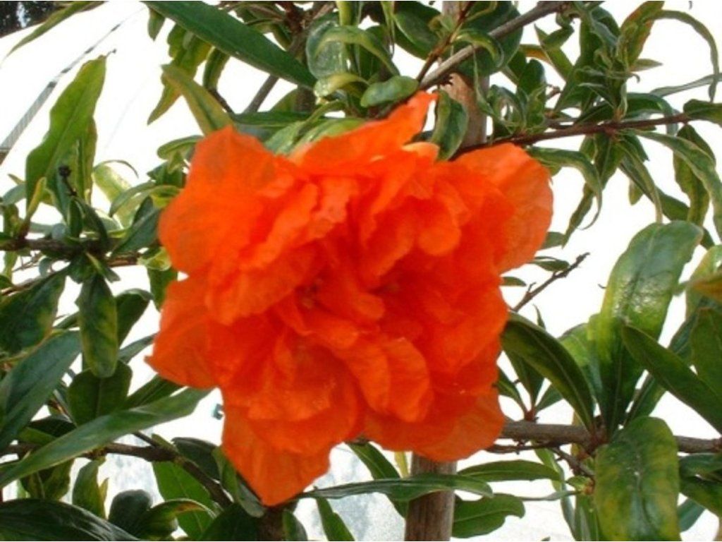 Granatapfel 'Pleniflora' - Die Sorte 'Plenifolia' wird hauptsächlich wegen ihrer vollen, glockenförmig geöffneten Blüten in orange- bis scharlachroten Tönen angebaut. Sie entwickeln sich aus einem fleischigen Kelch und wirken in der Sonne wie zerknittertes Seidenpapier. Die Blütezeit beginnt normalerweise im Juni, dauert im Juli an und klingt im warmen Sommer bis in den August hinein aus. Der Strauch ist laubabwerfend, mit schmalen, ganzrandigen, glänzend dunkelgrünen Blättern, die sich im Herbst gelb färben. Triebe können Dornen tragen und mit zunehmendem Alter wirkt das Gehölz baumartig. Unter den Bedingungen der Tschechischen Republik erreicht er meist eine Höhe von 2–3 m und eine Breite von 1,5–2 m, bei der Kultivierung im Topf bleibt er je nach Größe des Topfes kompakter. Volle Blüten sind teilweise steril, daher bilden sich essbare Früchte nur selten und reifen bei erfolgreicher Anlage sehr spät, oft erst Ende Oktober oder Anfang November. Wenn sich Früchte bilden, besteht der essbare Teil aus saftigen Samenmäntchen, die frisch in Salaten und Desserts verwendet oder zu Saft gepresst werden. Sie enthalten natürlich organische Säuren, Mineralstoffe und Polyphenole, was sie zu einer geschätzten kulinarischen Zutat macht. Die Sorte blüht hauptsächlich an den diesjährigen Trieben, sodass sie nach dem Frühlingsschnitt normalerweise wieder Knospen ansetzt. Sie findet Anwendung in Kübeln, auf warmen Vorgärten und an Südwänden, wo sie gut mit Lavendel, Salbei, Lampenputzergras und Ziergräsern harmoniert.