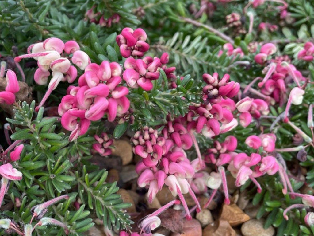 Grevillea 'Red Salento' - interessanter, kleiner Strauch mit Blättern, die Rosmarinnadeln ähneln. Wächst auf eine Höhe von 1m und eine Breite von 1-1,5m. Hat ungewöhnlich geformte, abgerundete Blüten in Rosa- und Weißtönen, die zu zwei Jahreszeiten im Jahr erscheinen. Die erste ist von November bis Februar und die zweite von Juni bis August. Unter unseren Bedingungen ist er bis -12°C frostbeständig.