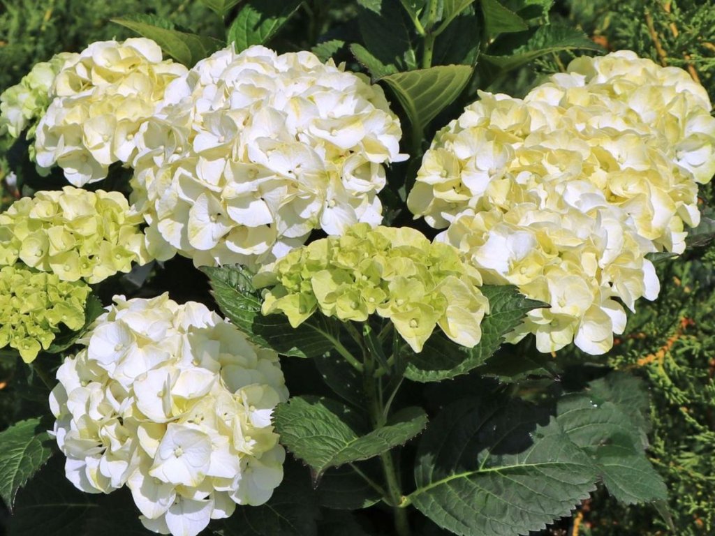 Bauernhortensie 'Caipirinha®' - eine sehr gelungene, neuere Sorte, die aufgrund ihrer gepflegten, kompakten Form, guten Verzweigung und insbesondere ihrer reichen Blüte beliebt geworden ist. Der gesamte Strauch wächst bis zu 1 m Höhe und ist dicht belaubt. Anfang Sommer erscheinen cremefarbene, gelbe, grünliche Knospen, die sich weißlich mit einem Hauch von Grün verfärben. Zum Ende der Saison verfärben sie sich dann rot. Die Blätter sind groß, eiförmig und frischgrün. Diese Hortensie kommt als Teil jeder Gruppenbepflanzung oder einzeln als Solitär, der im Topf kultiviert werden kann, hervorragend zur Geltung. Die Hortensie macrophylla blüht am Holz des Vorjahres, daher entfernen wir im Frühjahr nur die durch Frost beschädigten Triebspitzen. Insgesamt ist die Bauernhortensie ein beliebtes Element für Gärten und verleiht jedem Garten ein erhabenes und romantisches Aussehen. Helle Blüten kommen auf dunklem Hintergrund hervorragend zur Geltung.