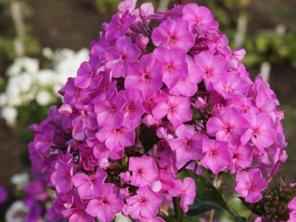 Phlox 'Minnehaha' - eine nordamerikanische Art von Waldrändern und lichten Tälern, geschätzt für ihre breiteren Blätter und ihr gleichmäßiges Wachstum. Die Sorte 'Minnehaha' wurde vom deutschen Züchter Walter Schimana gezüchtet und 2006 in den Anbau gebracht. Die Pflanze bildet buschige, aufrechte Stängel mit festeren, tiefgrünen Blättern, die während der gesamten Saison dekorativ bleiben. Von Juni bis August entwickeln sich an den Spitzen der Stängel dichte Blütenstände, in denen sich sternförmig angeordnete Blüten öffnen. Die Grundfarbe ist himbeerrosa bis violettrosa, in der Mitte mit einem karminroten Auge, das die Tiefe der Blüte hervorhebt. Der zarte Duft lockt Bienen und Schmetterlinge an und die Blüte eignet sich auch als Schnittblume. Im Beet lässt sie sich gut mit weißen Margeriten, blauen Ehrenpreisen, mit Sonnenhüten und mit Gräsern kombinieren, wo der Rosaton weich und natürlich wirkt. Die Blütenstände sind unter guten Bedingungen 8–10 cm breit und auf einem Stiel öffnen sich nach und nach eine Reihe von Blüten, sodass der Farbeffekt mehrere Wochen anhält. Nach der Blüte bilden sich kleine Samenkapseln, die in warmen Sommern in die Umgebung auswachsen können.