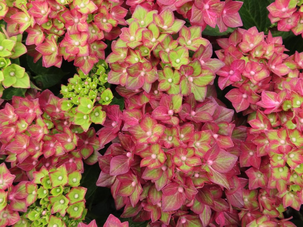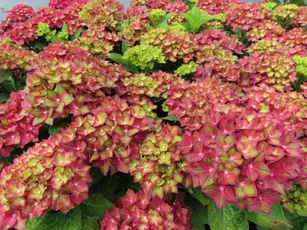Bauernhortensie Rebellion® 'Red Love'- eine lizenzierte Sorte aus der Serie Rebellion®, gezüchtet für kompaktes Wachstum, gute Frostbeständigkeit und reiche Blüte. Sie basiert auf der Art der Bauernhortensie, die aus feuchteren Wäldern und Berghängen Japans stammt. Im ausgewachsenen Zustand erreicht sie eine Höhe von ca. 1,5 m und eine Breite von ca. 0,8 m. Sie bildet einen dichten, aufrechten Strauch mit herzförmig-eiförmigen, dunkelgrünen Blättern mit ausgeprägter Spitze und gesägtem Rand. Von Juni bis September erscheinen an den Enden neuer Triebe große, kugelförmige Blütenstände, die anfangs pistaziengrüne Töne aufweisen und sich allmählich in himbeerrote bis rot-rosa Farbtöne verfärben. Die Blüten sind überwiegend steril, daher bilden sie volle Kugeln, die sich auch zum Schnitt und für einfache Trockenbindereien eignen. In Kompositionen eignet sich die Sorte als Solitär in einer halbschattigen Ecke, in Kombination mit weißen oder blauen Hortensien, Funkien, Farnen oder Ziergräsern. Insgesamt ist die Bauernhortensie ein beliebtes Element für Gärten und verleiht jedem Garten ein erhabenes und romantisches Aussehen.