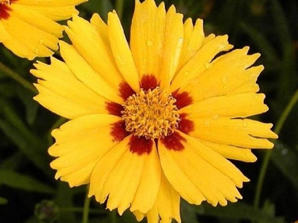 Coreopsis grandiflora 'Calypso' - ab Mai bildet sie einfache, feurig gelb-orange Blüten in Form einer großen Margerite mit einem dunkelweinrot-braunen Auge in der Mitte. Sie erreicht eine Höhe von 40 cm. Sie ist eine beliebte Pflanze für Balkonkästen und mobile Behälter.