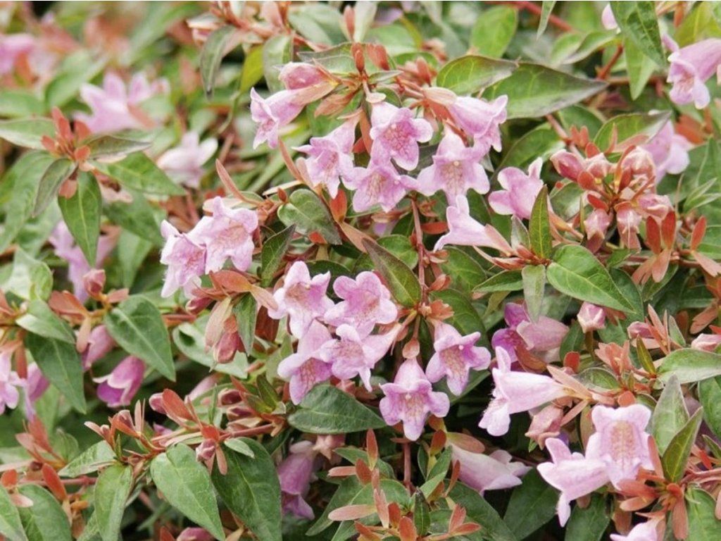 Großblütige Abelie 'Edward Goucher' - dekorativer, teilweise laubabwerfender Strauch mit kompaktem, ovalem Wuchs, der 0,9–1,5 m in die Höhe und ähnlich in die Breite erreicht. Die Zweige sind aufrecht bis elegant bogenförmig, besetzt mit dunkelgrünen, ovalen Blättern, die im Frühling einen zarten Bronzeton annehmen und sich im Herbst in violett-braune Töne verwandeln, wodurch ein ganzjähriger dekorativer Effekt erzielt wird. Die Sorte blüht vom Sommer bis fast zum Herbst mit kleinen, trichterförmigen, violett-rosa Blüten, von denen einige auch nach dem Laubfall an den Stielen verbleiben. Sie blüht am neuen Holz, was einen regelmäßigen Schnitt zur Erhaltung der Dichte und Form ermöglicht. Sie ist anspruchslos, widerstandsfähig gegen gängige Krankheiten und Schädlinge und lässt sich gut formen. In Gartengestaltungen findet sie Verwendung als Solitär, Teil von Gruppenpflanzungen, Zierstrauch in Beeten oder für niedrige Hecken, wo sie für farbliche Kontraste und eine feine Textur von Blättern und Blüten sorgt. Dank ihres kompakten Wuchses und ihrer langen Blütezeit eignet sie sich für mittelgroße Gärten, Balkone und Terrassen.