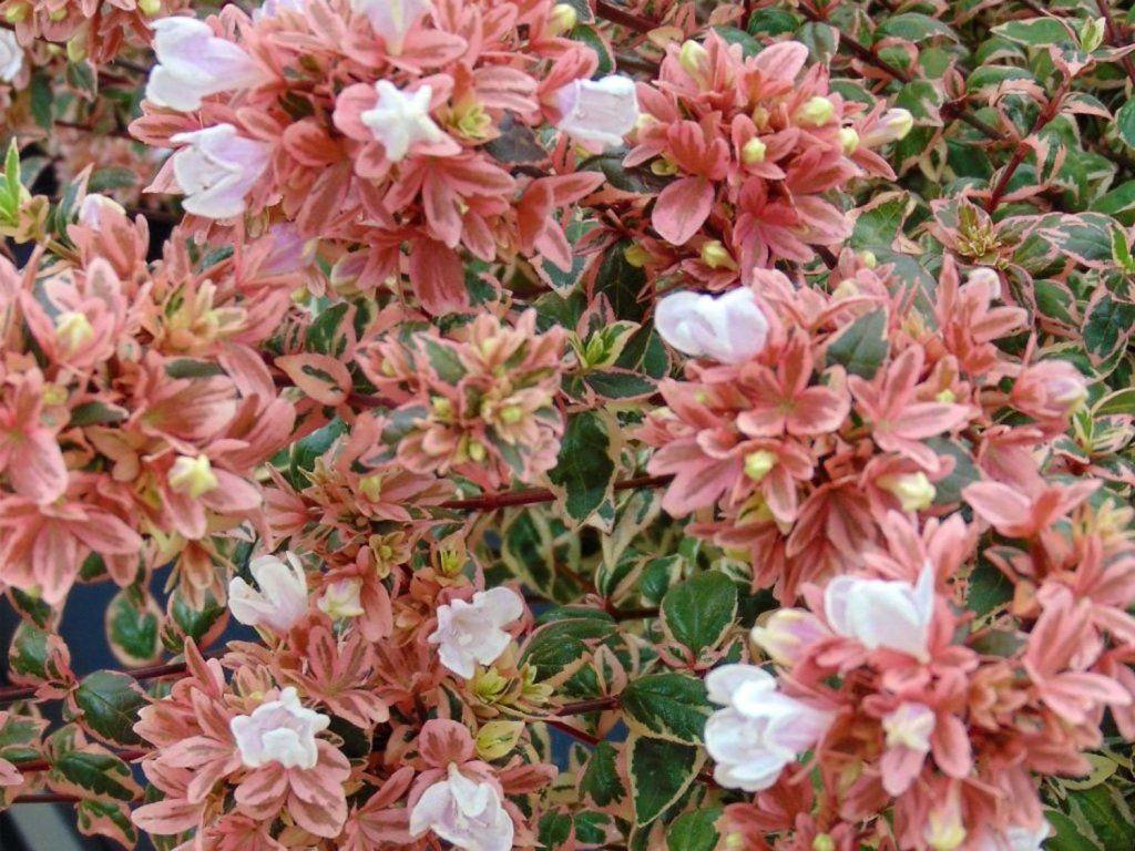 Abelia grandiflora 'Magic Daydream' - ein Zierstrauch, der durch sein farbenprächtiges Laub und seine üppige Blüte besticht. Er erreicht eine Höhe von 60-80 cm und hat einen dichten, ausladenden Wuchs, was ihn ideal für kleinere Gärten, Terrassen oder Kübel macht. Die Blätter sind klein, glänzend und ändern ihre Farbe während der Saison - im Frühling treiben sie kupferfarben aus, im Sommer werden sie tiefgrün und im Herbst färben sie sich in Orange- und Rottönen. Er blüht vom Sommer bis in den Herbst. Die Blüten sind röhrenförmig, zartrosa bis weiß, duftend und bedecken den gesamten Strauch üppig, wodurch sie Schmetterlinge und andere Bestäuber anziehen. Sie ist pflegeleicht, verträgt Rückschnitt gut und ist frostbeständig.