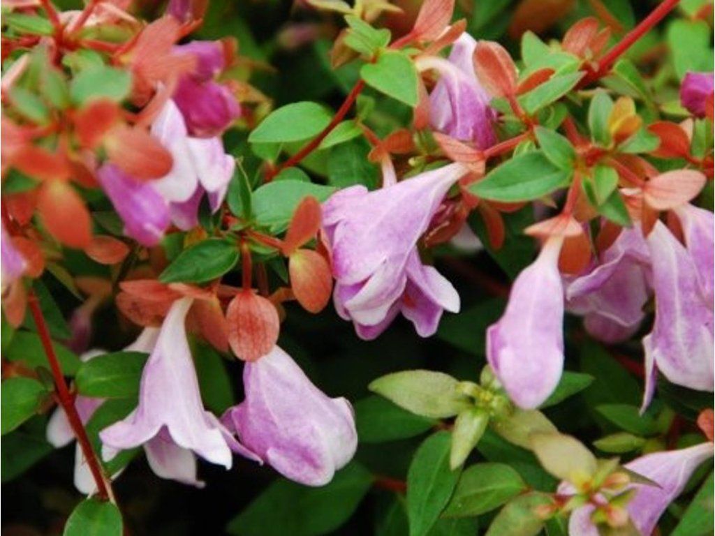 Abelia grandiflora PINKY BELLS 'Lynn'- ein kleiner, laubabwerfender Strauch, der eine Höhe von 0,4-0,6m und eine Breite von 0,5-1m erreicht. Der Habitus ist sehr kompakt. Die glockenförmigen Blüten sind etwas größer als üblich für die Art. Sie haben eine hellrosa bis violette Farbe und erscheinen von Juni bis Oktober. Junge Zweige dieses Strauches haben eine satte, weinrote Farbe. Spitze Blätter sind grün, im Herbst färben sie sich weinrot. Geeignet für niedrige Hecken oder für den Anbau in Behältern.
