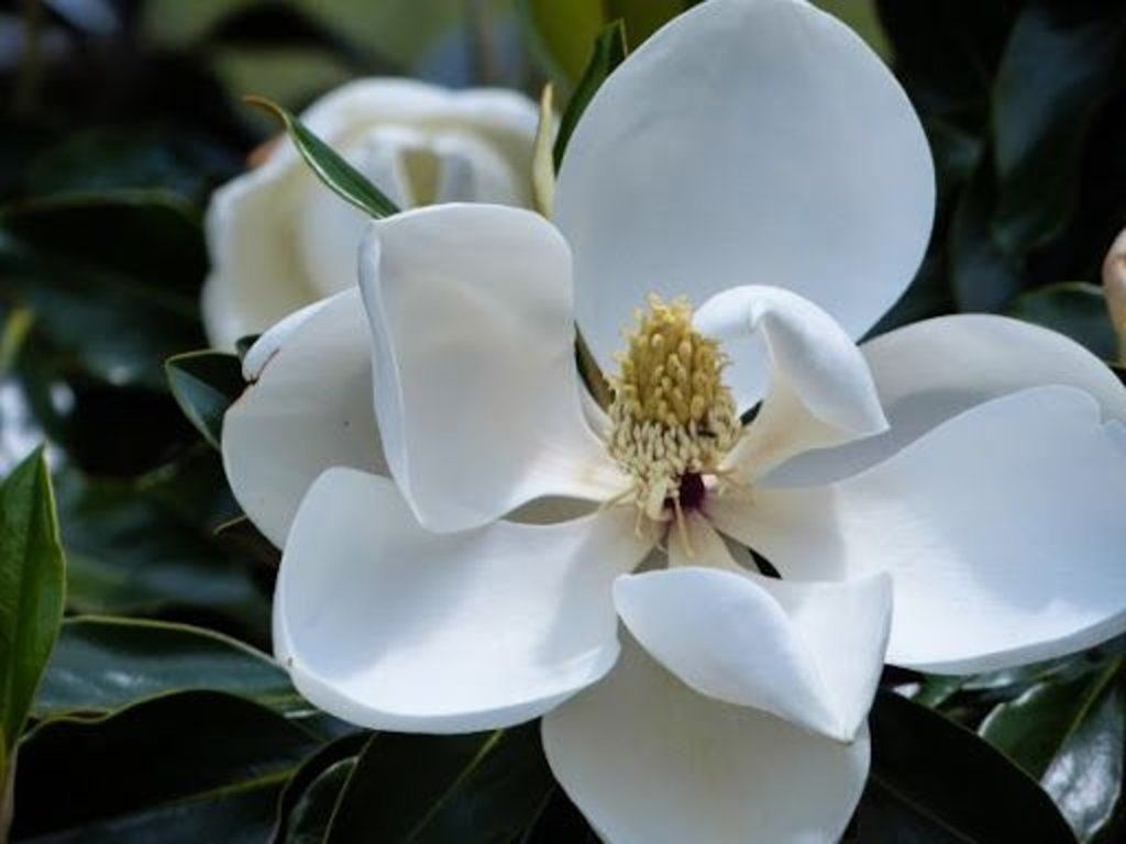 Die Großblütige Magnolie (Magnolia grandiflora) ist ein immergrüner Baum aus dem Südosten der USA. Diese beeindruckende Pflanze ist bekannt für ihre großen, duftenden Blüten und ihr glänzend grünes Laub. In ungezüchteter Form kann sie bis zu 30 m hoch werden. Die Blätter sind ledrig und immergrün, oft mit bräunlichen Härchen auf der Unterseite, und erreichen eine Länge von bis zu 20 cm. Die Blüten sind herrlich duftend, weiß und riesig, mit einem Durchmesser von bis zu 30 cm, und fallen durch ihre Größe und ihren intensiven Duft auf. Magnolia grandiflora blüht den ganzen Sommer über an einjährigen Trieben, was bedeutet, dass sie ständig neue Blütenknospen bildet und so eine lange Blütezeit gewährleistet. Die Pflanze kann durch Schnitt geformt werden, was die Möglichkeit bietet, ihr Wachstum nach Bedarf zu gestalten und anzupassen. Nach der Blüte bilden sich zapfenartige Früchte, die Samen enthalten, die von einer roten fleischigen Hülle umgeben sind. Die Großblütige Magnolie bevorzugt sonnige und geschützte Standorte und gedeiht gut in tiefen, gut durchlässigen Böden. Sie ist resistent gegen die meisten Krankheiten und Schädlinge, was diese Pflanze zu einer relativ anspruchslosen Wahl für den Garten macht. Für ein schönes Aussehen muss sie regelmäßig gedüngt werden, vorzugsweise mit Düngemitteln für säureliebende Pflanzen. Diese Magnolie ist als Zierbaum in wärmeren Regionen beliebt und kann als Solitär oder als Teil einer Baumgruppe gepflanzt werden, was ein markantes visuelles Element im Garten darstellt. Die Großblütige Magnolie ist ein attraktiver Baum, der sich durch große Blüten und immergrünes Laub auszeichnet, was ihn zu einer beliebten Wahl für Gärtner und Pflanzenliebhaber auf der ganzen Welt macht.