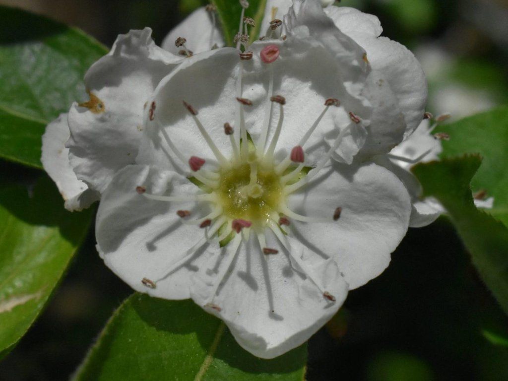 Weißdorn - eine ursprüngliche wildwachsende Hybride zwischen Mispel und Weißdorn, wächst bis zu einer Höhe von 3-4 m. Es bildet einen kleinen, laubabwerfenden Baum mit rundlicher Krone und herabhängenden unteren Ästen. Die Blätter sind fein gezähnt, oval oder verkehrt-eiförmig und dunkelgrün. Im Herbst färben sie sich orange-gelb. Sie blüht im Übergang vom Frühling zum Sommer mit rosa-weißen Blüten, die Kirschblüten ähneln. Im Herbst bilden sich kugelförmige Früchte, die den Hagebutten ähneln, aber größer sind. Sie sind bräunlich-orange und haben einen Stiel.