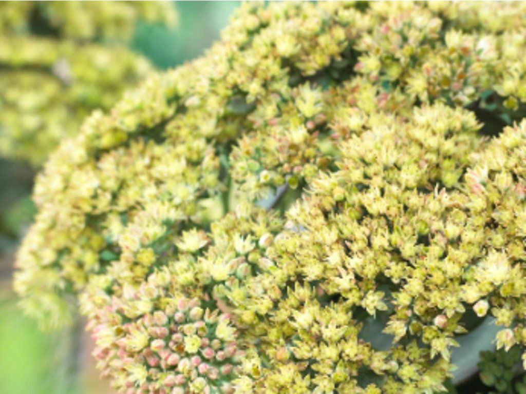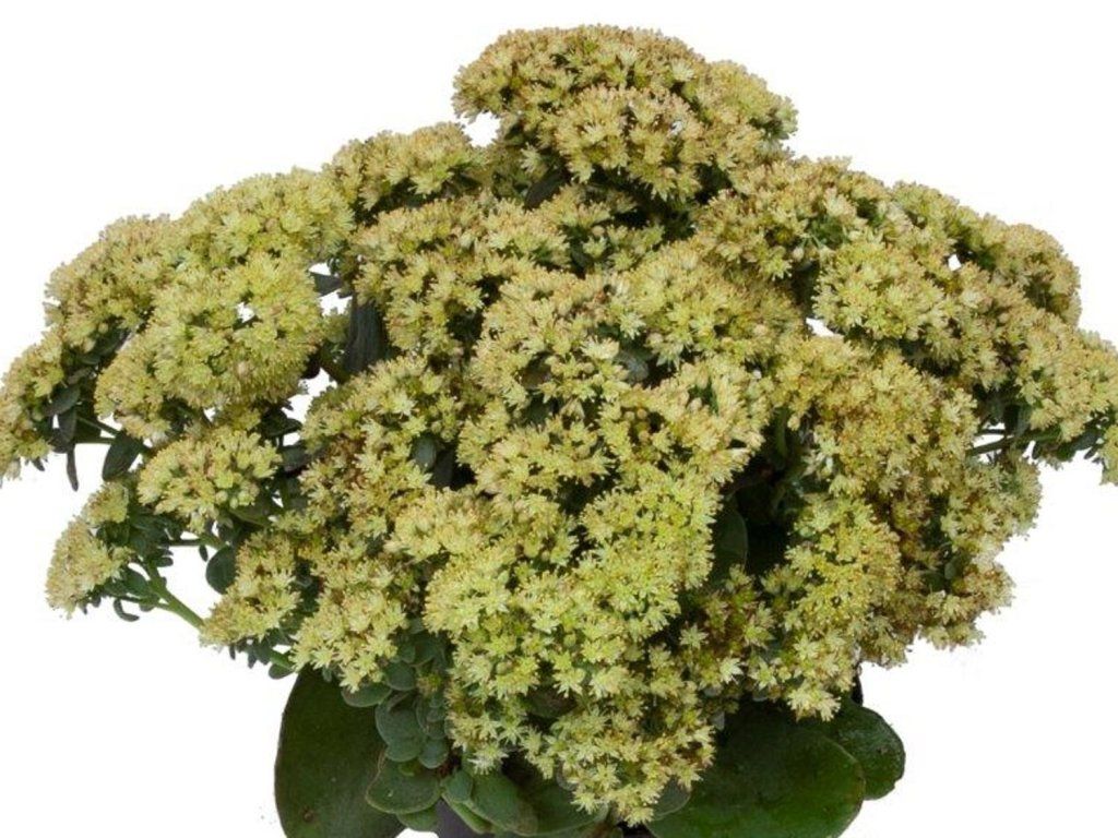 Große Fetthenne 'Green-Yellow' - eine einzigartige Sorte der Großen Fetthenne aus der Familie der Dickblattgewächse (Crassulaceae), gezüchtet für die ungewöhnliche Blütenfarbe und den ausgewogenen Habitus. Die botanische Art Sedum telephium stammt aus Europa und Westasien, wo sie natürlich auf trockenen Wiesen, steinigen Hängen und sonnigen Waldrändern wächst. Die Sorte ‚Green-Yellow‘ bildet aufrechte, feste Stiele mit fleischigen, ovalen Blättern in weingrüner Farbe mit feinem Reif. Im ausgewachsenen Zustand erreicht sie eine Höhe und Breite von etwa 40-50 cm und bildet kompakte, gut abgegrenzte Horste. Von August bis September erscheinen an den Triebspitzen flache, schirmförmige Blütenstände mit einem Durchmesser von etwa 10-12 cm, bestehend aus kleinen sternförmigen Blüten in grün-gelben bis gelb-grünen Farbtönen. Die Blütenfarbe verändert sich während der Blütezeit leicht und verleiht der Pflanze einen langanhaltenden dekorativen Effekt. Die Blüten bieten im Spätsommer eine Quelle für Nektar und Pollen für Bienen, Hummeln und andere Bestäuber. Nach der Blüte trocknen die Blütenstände ein und bleiben auch im Herbst dekorativ, wenn sie zur Struktur des Beetes beitragen. Die Sorte lässt sich gut mit Ziergräsern, Lavendel, Sonnenhut oder Stauden mit dunklerem Laub kombinieren, wo ihre ungewöhnliche Farbe zur Geltung kommt.