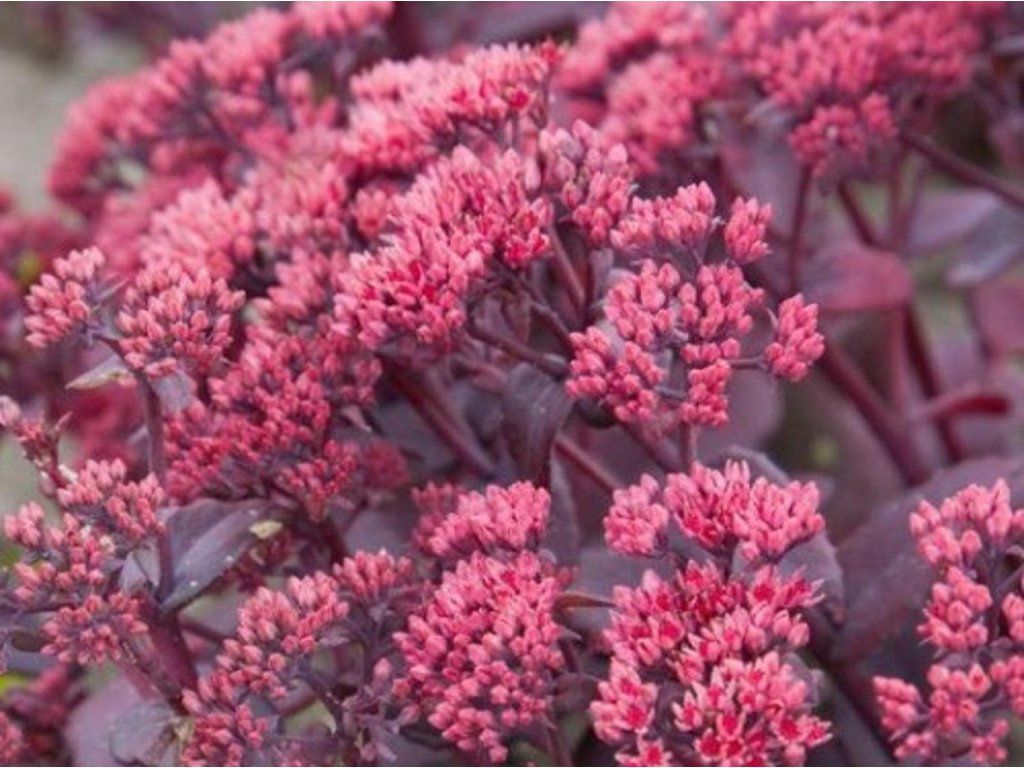 Hohe Fetthenne 'Seduction Cherry Chocolate' - Die Seduction®-Serie entstand in der Züchtung der Firma Florensis mit dem Ziel, regelmäßige, kompakte Horste mit festen Stielen und intensiverer Blatt- und Blütenfarbe anzubieten, die auch für kleinere Gärten geeignet sind. Die Sorte 'Seduction Cherry Chocolate' bildet einen dichten, sukkulenten Horst, dessen Triebe im Frühjahr fleischige, eiförmige bis elliptische Blätter in dunkelgrünen bis purpurbraunen Tönen tragen. Im Sommer erheben sich über dem Laub flache Dolden, die sich nach und nach öffnen. Von Juli bis September tragen sie kleine sternförmige Blüten in Kirschrot- bis Dunkelrosa-Tönen, die intensiv von Bienen und Schmetterlingen besucht werden. Nach der Blüte trocknet der Blütenstand zu dekorativen Köpfen, die auch im Wintergarten erkennbar bleiben und sich gut für Trockenbindereien eignen. Die Pflanze behält ihre Silhouette gut ohne Stützen und bildet im Beet einen dunklen Akzent, der helle Blüten von Sonnenhut, Schafgarbe und Herbstastern hervorhebt. Zur Blütezeit erreicht sie in der Regel 30–50 cm, die Breite des Horstes liegt bei etwa 40–50 cm. Der Blütenstand ist auch für den Schnitt verwendbar, hält in der Vase auch ohne große Pflege seine Form und geht allmählich in eine trockenere, pastellfarbene Phase über.