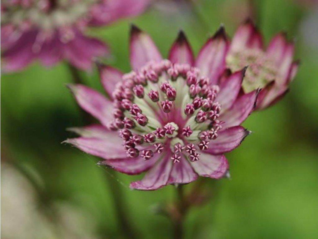 Sterndolde 'Burgundy Manor' - winterharte Staude, die eine bodennahe Rosette aus handförmig geteilten, grünen Blättern mit feiner violetter Färbung bildet. Ab Juni blüht sie mit weinroten Blüten, die zu bestimmten Zeiten fast bordeauxrot sind. Sie erreicht eine Höhe von 40-45 cm und eine Breite von 40-50 cm. Wird auch für Blumenarrangements verwendet. Insgesamt ist die Sterndolde ein beliebtes Element in jedem Garten und verleiht ein zartes und romantisches Aussehen.