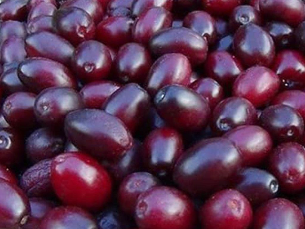 Hartriegel großfruchtig 'Raciborski' - ein langlebiges Obstgehölz aus Süd- und Mitteleuropa sowie Westasien, das in der Natur an lichten Waldrändern und auf buschigen Hängen wächst, oft auf kalkhaltigen Böden. Die Sorte 'Raciborski' ist eine polnische großfruchtige Selektion, benannt zu Ehren des Botanikers Marian Raciborski. Wächst langsamer bis mittelschnell zu einem dichten, breit ausladenden Strauch oder kleinen Baum, normalerweise 3–5 m hoch und 2,5–4 m breit. Im März bis April erscheinen an den kahlen Zweigen gelbe doldenförmige Blütenstände, die eine wichtige frühe Quelle für Nektar und Pollen für Bienen sind. Die Blätter sind elliptisch, auf der Oberseite glänzend grün, im Herbst verfärben sie sich in gelb-orange bis rötliche Töne. Die Früchte sind längliche Steinfrüchte von dunkelkirschroter Farbe, normalerweise mit einem Gewicht von 3–3,5 g, mit einem ausgewogenen Verhältnis von Zucker und Säuren, und reifen ab der ersten Septemberhälfte. In der Küche können sie frisch oder nach Wärmebehandlung verwendet werden, sie behalten gut ihre Form in Kompotten, eignen sich für Marmeladen, Säfte und Mazerate. Kornelkirschen enthalten natürlicherweise Vitamin C, organische Säuren und Pektine, daher werden sie auch zum Einmachen geschätzt.