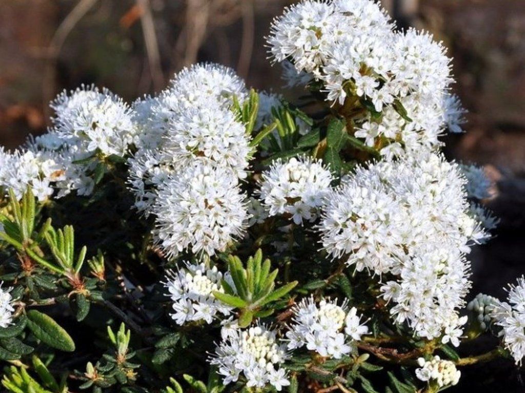 Grönlandischer Rosmarin 'Helma' - eine bei uns weniger bekannte Pflanze, die aus den kalten und subarktischen Regionen Grönlands stammt. Es handelt sich um einen unter unseren Bedingungen voll frostbeständigen, abgerundeten und immergrünen Strauch, der eine Höhe von 30 - 50 cm erreicht. Im Mai und Juni blüht er üppig. Die Blüten sind in endständigen Blütenständen mit einem Durchmesser von 30-50 mm gruppiert. Die Blüten selbst sind sternförmig, schneeweiß und interessant aromatisch. Die Blätter sind hellgrün, auf der Unterseite leicht behaart und können im späteren Alter verrosten. Eine ideale Pflanze zur Belebung jeder Gruppenzusammensetzung oder als Unterwuchs unter höheren Bäumen und Sträuchern.