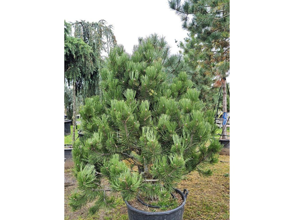 Steinkiefer 'Compact Gem' - stammt aus den Bergregionen des Balkans und Süditaliens, wo sie hauptsächlich auf Kalkstein und Geröllhalden wächst. Die Art wurde von H. Christ im Jahr 1863 beschrieben und wird in der gärtnerischen Praxis auch weiterhin unter dem Synonym P. leucodermis geführt. Der Kultivar 'Compact Gem' gehört zu den langsam wachsenden Auslesen mit einem kompakten, dicht verzweigten Habitus eines breiten Kegels bis zur abgerundeten Pyramide, der auch für kleinere Gärten geeignet ist. Im Erwachsenenalter erreicht sie normalerweise eine Höhe von etwa 2,5–3 m und eine Breite von 1,5–2 m. Die Nadeln sind steif, glänzend dunkelgrün, 6–11 cm lang, zu zweit in Büscheln und sammeln sich auffällig an den Zweigenden, wodurch die Krone „bürstenartig“ wirkt. Auf älteren Pflanzen hebt sich die graubraune Rinde hervor, die in ein Mosaik zerbrochen ist, wobei in den Rissen ein gelblicher Farbton zum Vorschein kommt. Die Zapfen sind oval, anfangs dunkelgrün bis violett, und werden beim Reifen braun. In der Komposition kommt sie mit Wacholder, Bergkiefern und Ziergräsern zur Geltung und bietet auch im Winter eine immergrüne Struktur. Dank des Kontrasts zwischen den dunklen Nadeln und der hellen, „schlangenartigen“ Rinde eignet sie sich als Solitärpflanze für den Vorgarten und für moderne Architektur. Aufgrund ihres langsamen Wachstums und ihrer geringen Höhe ist sie die ideale Pflanze für kleinere Gärten.