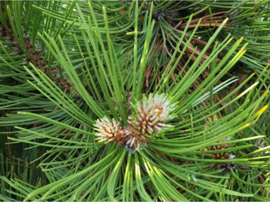 Borovice bělokorá - eine Kiefer, die je nach Wachstumsbedingungen 15 - 20 m hoch wird. Die Nadeln sind etwa 10 cm lang und bleiben etwa 6 Jahre am Baum. In der Jugend hat sie ein schmales und aufrechtes Wachstum, die Verzweigung ist regelmäßig. Allmählich wird die Krone kegelförmig, die Verzweigung ist horizontal und die Äste bilden unregelmäßige Etagen. Die Nadeln sind grün, glänzend und wachsen in Büscheln. Die Zapfen sind gelblich bis bräunlich gefärbt und eiförmig.