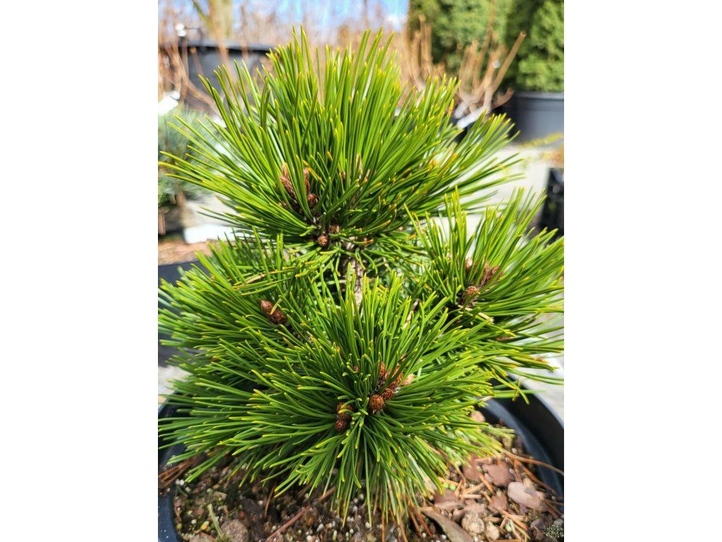 Pinus heldreichii 'Hald Koryta'- eine Gebirgsart, die vom Balkan und aus Süditalien stammt und auf felsigen und kalkhaltigen Hängen in Höhenlagen von etwa 900–2.000 m wächst. In ihrer natürlichen Umgebung ist sie starkem Wind, Trockenheit und starken Temperaturschwankungen ausgesetzt, was ihre Widerstandsfähigkeit und Langlebigkeit erklärt. Die Sorte ‘Hald Koryta’ wurde wegen ihres kompakteren Wuchses und ihres dicht verzweigten, regelmäßigen Habitus ausgewählt. Im Erwachsenenalter erreicht sie eine Höhe von etwa 1,8–2,2 m und eine Breite von 1,5–2 m, der jährliche Zuwachs beträgt etwa 10–15 cm. Die Krone ist kegelförmig bis breit kegelförmig, natürlich dicht und muss nicht geformt werden. Die Nadeln wachsen in Büscheln zu je zweien, sind fest, dunkelgrün, 6–9 cm lang und verbleiben mehrere Jahre an den Zweigen, was auch im Winter ein volles immergrünes Aussehen gewährleistet. Die Zapfen sind eiförmig bis kegelförmig, 6–8 cm lang und reifen im zweiten Jahr. Die Sorte eignet sich als Solitärpflanze in kleineren Gärten, in Felsbereichen oder Schotterbeeten, wo sie ein stabiles und visuell ruhiges Element bildet. In Kompositionen ergänzt sie gut trockenheitsliebende Stauden, Lavendel oder niedrige Ziergräser.