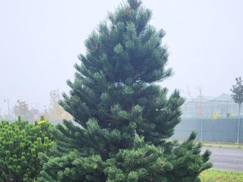 Zirbelkiefer - eine langsamer wachsende Kiefernart, die eine Höhe von 10 - 20 m und eine Breite von 3 - 6 m erreicht. Der Habitus ist eher kegelförmig. Die Form ist baumartig, sie hat einen Endtrieb (zentraler Stamm), was das wichtigste Erkennungsmerkmal im Vergleich zur gewöhnlichen Bergkiefer ist. Kommt sowohl als Solitär als auch in Gruppenpflanzungen zur Geltung. Die Rinde ist grau, nach dem Abblättern dunkel. Lange Nadeln wachsen meist paarweise und haben eine dunkelgrüne Färbung. Zapfen erscheinen erst nach einigen Jahren und sind braun.