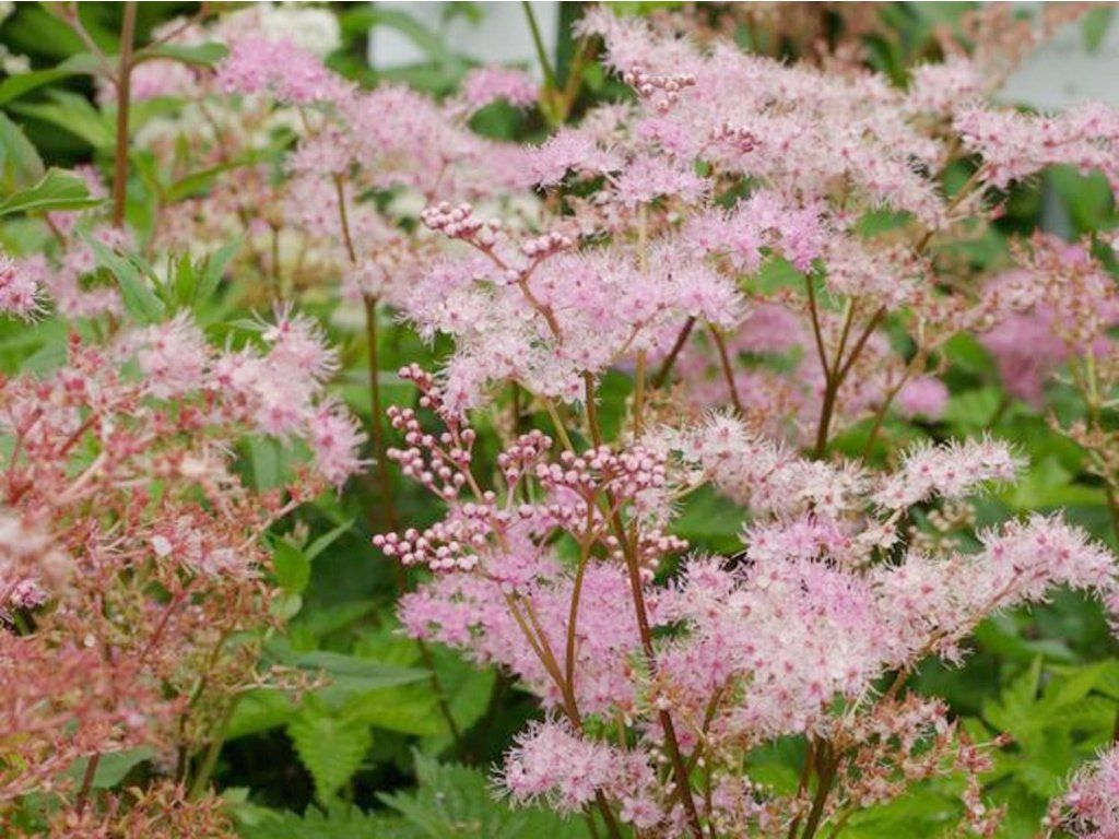 Spierstrauch 'Nana' - eine kompakte, ausläuferbildende Staude aus der Familie der Rosengewächse, basierend auf einer in Ostasien verbreiteten Art von Feuchtwiesen bis zu lichten Waldrändern. Im Garten bildet sie regelmäßige Horste, die sich langsam seitlich ausbreiten und ihre Form ohne Stützen halten. Die Blätter sind auffallend handförmig in 5–7 Lappen geteilt, mit feinem Sägeblatt-Rand und ausgeprägter Nervatur, in der Saison dunkelgrün bis frischgrün, im Herbst oft mit wärmeren orange- bis rötlichen Tönen. Von Juli bis August wachsen über den Blättern luftige, rispenartige Blütenstände von etwa 10–20 cm Länge, bestehend aus kleinen rosa Blüten mit Büscheln von Staubgefäßen. Blüten und Blätter können einen zarten, honigsüßen Duft haben und werden von Bestäubern gerne aufgesucht. In der Vase hält der Blütenstand in der Regel einige Tage, wenn er in der Phase frisch geöffneter Blüten geschnitten wird. Die Höhe zur Blütezeit liegt bei etwa 30–40 cm, die Horstigbreite üblicherweise bei 40–50 cm. Sie findet Anwendung in den vorderen Bereichen von Beeten, in Staudenrändern an Wegen, am Wasserrand und in Kübeln, wo die rosa Rispen wie ein zarter Schleier über den Blättern wirken. In der Komposition harmoniert sie gut mit Funkien, Farnen, Purpurglöckchen, Storchschnäbeln und Seggen, wo sie Leichtigkeit ohne die „schwere“ Masse hoher Mädesüßarten hinzufügt.