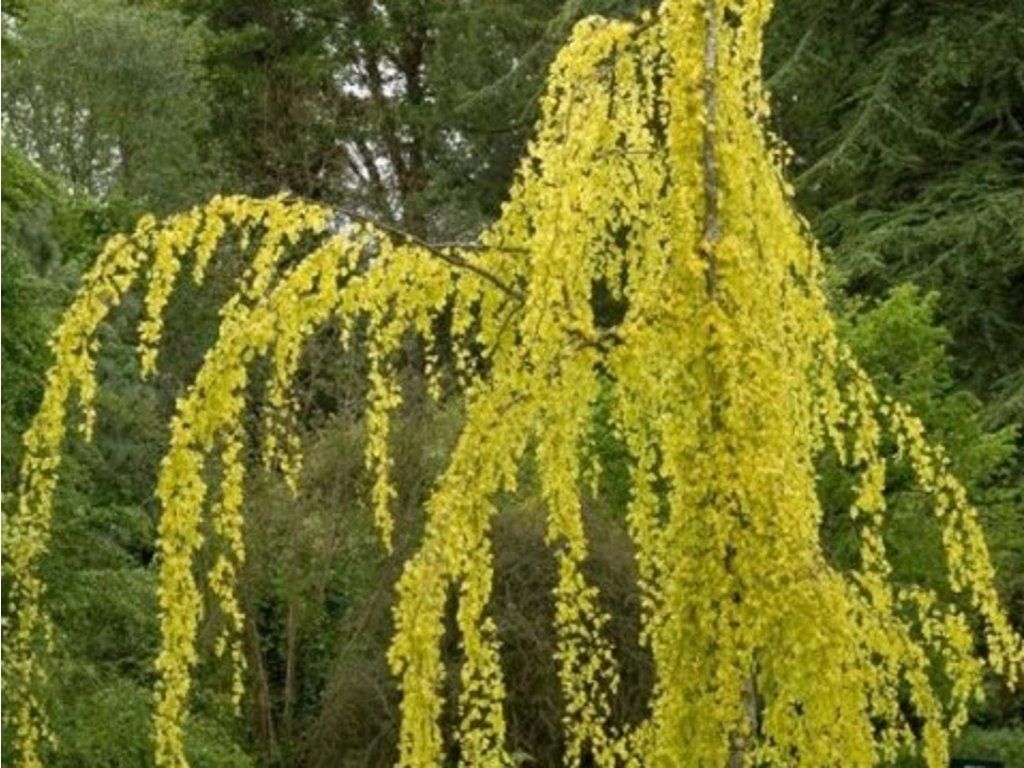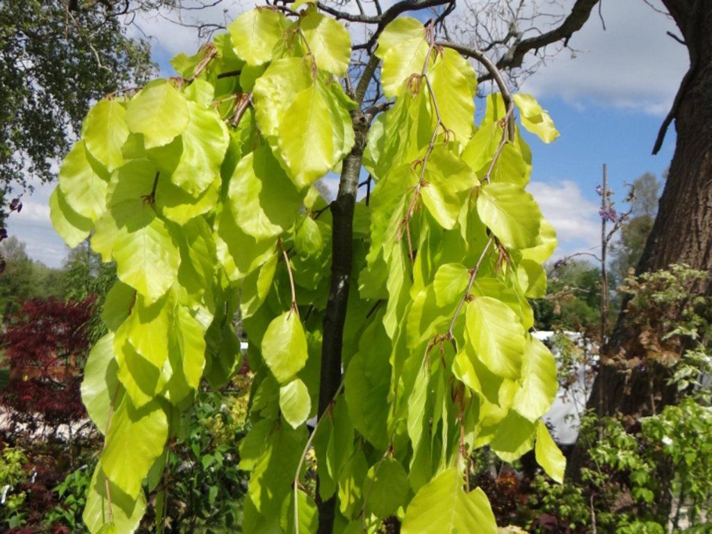 Rotbuche 'Aurea Pendula' - ein hoher, sehr anmutiger Baum, der im Erwachsenenalter eine Höhe von 15-20 m erreicht. Er bildet eine dichte Krone von unregelmäßiger Form, bei der die überhängenden Seitenäste, die aus den mittleren Leittrieben wachsen, fast bis zum Boden reichen. Die Blätter sind oval bis eiförmig, mit leicht gewelltem Rand. Sie sind etwas größer als für diese Art typisch. Sie haben im Frühjahr eine goldgelbe Farbe, im Sommer sind sie grüner, aber immer noch mit einem Gelbanteil. Im Herbst sind sie bräunlich-gelb. Vorsicht vor zu starker Sonne, die Blätter könnten verbrennen.