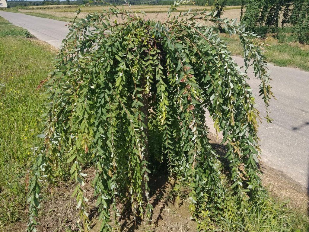 Hänge-Weide 'Pendula' - breit ausladender, hängender Strauch, erreicht eine Höhe von 1,5-1,8 m und eine Breite von 2-3,5 m. Beliebter Strauch zum Veredeln auf einen Stamm. Die Blätter sind gegenständig, schmal elliptisch bis länglich, 3-6 cm lang, ganzrandig, hellgrün, auf der Unterseite weißlich, abfallend.