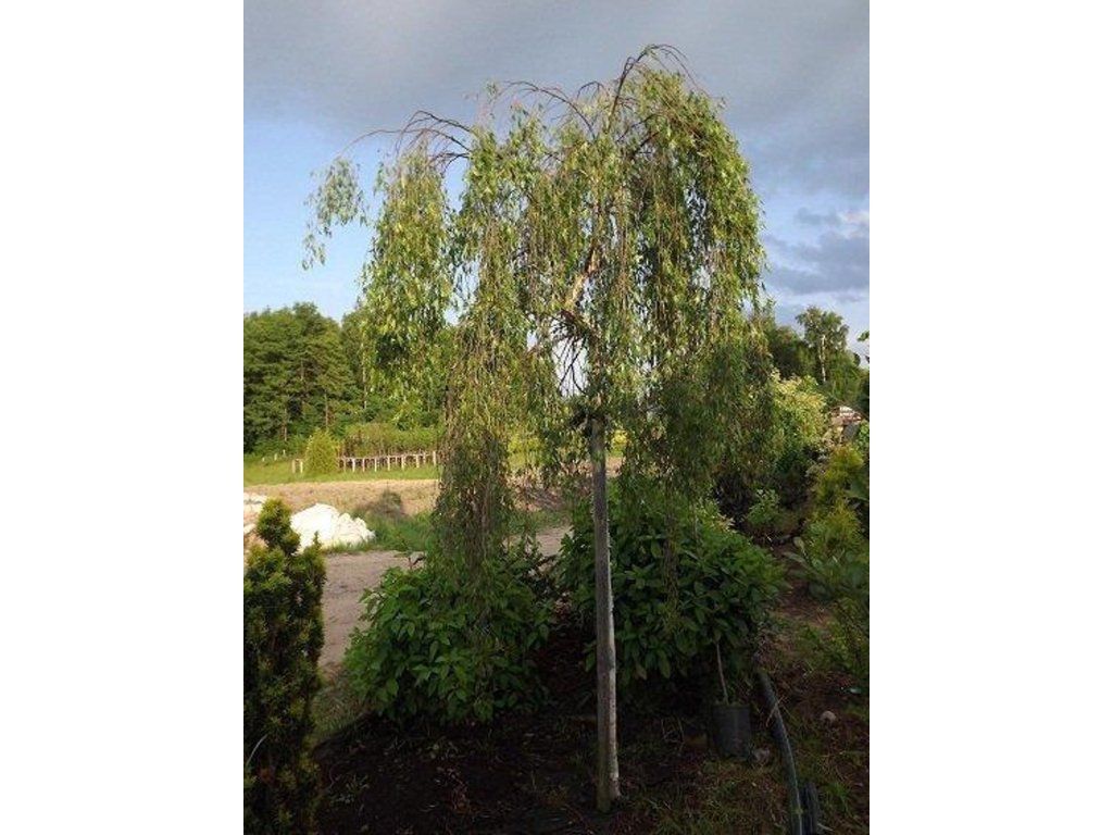 Hänge-Birke 'Gracilis' - eine sehr elegante Zuchtform der Hänge-Birke mit überhängendem Charakter. Das überhängende bis trauernde Wachstum zusammen mit der typischen abblätternden weißen Papierrinde gehört zu den Hauptvorteilen dieses Baumes. Er erreicht eine Höhe von 6 m, je nach Kultivierungsbedingungen. Wächst relativ langsam, der jährliche Zuwachs beträgt etwa 30-40 cm. Die Blätter sind deutlich tief gelappt, hell- bis leuchtendgrün, glänzend. Der Stamm und die stärkeren Äste sind mit weißer, glatter und sich kreisförmig ablösender Papierrinde bedeckt. Die Blüten sind zweihäusig, ohne Blütenhülle, in charakteristischen Blütenständen (Kätzchen) gesammelt. Verträgt jeden Bodentyp, auch saures Milieu ist geeignet. Winterhart. Eine ausgezeichnete Wahl für kleinere Gärten.