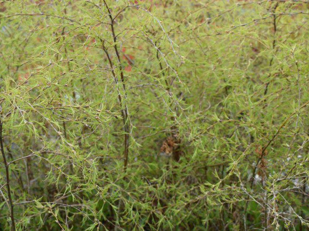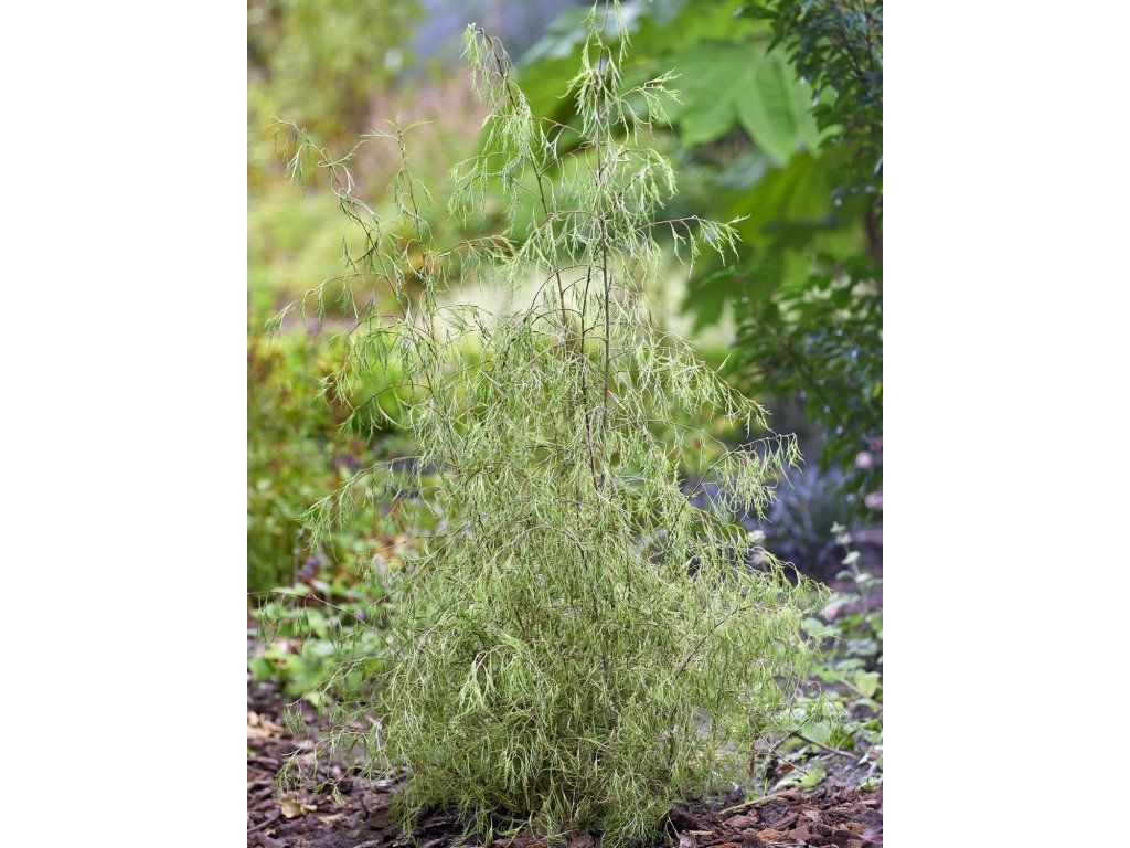Hänge-Birke 'Karaca' - ein Zwerg-Kultivar der Hänge-Birke aus der Familie der Birkengewächse. Im Gegensatz zur Grundart, die in der Landschaft Dutzende von Metern erreicht, wächst sie langsam und bildet ein kompaktes Bäumchen mit dichter Verzweigung. Die Zweige wachsen in einem breiteren Winkel und ihre Enden biegen sich bogenförmig nach unten, so dass die Krone wie ein zarter Schleier wirkt. Die größte Besonderheit sind die Blätter - sie sind laubabwerfend, hell- bis frischgrün, tief eingeschnitten in schmale Lappen, so dass sie auf den ersten Blick wie Spitze aussehen. Im Herbst verfärben sie sich in gelb-goldene Töne. Von März bis April erscheinen die Kätzchen, die im frühen Frühling Pollen liefern. Der Wintereffekt wird durch die typische helle Rinde der Hänge-Birke mit dunkleren Lentizellen ergänzt. Im Garten wird sie als Solitär am Eingang, am Rasenrand, in städtischen Vorgärten und in größeren Gefäßen eingesetzt, wo das Detail der Belaubung zur Geltung kommt. Die Blätter sind meist kleiner als bei der gewöhnlichen Hänge-Birke, oft 3–6 cm lang, und dank kürzerer Internodien wirkt die Krone auch ohne Formung zart. Junge Ästchen sind bräunlich, später gehen sie in die weißgraue Rinde über, die im Alter stellenweise in dünnen Streifen abblättert. In Kompositionen harmoniert sie gut mit Ziergräsern, Heidekrautgewächsen, Spiersträuchern oder Stauden mit silbernem Laub, z. B. Lavendel oder Beifuß. Birkenpollen sind im Allgemeinen stark allergen, was bei der Platzierung in der Nähe von Fenstern und Terrassen berücksichtigt werden sollte.