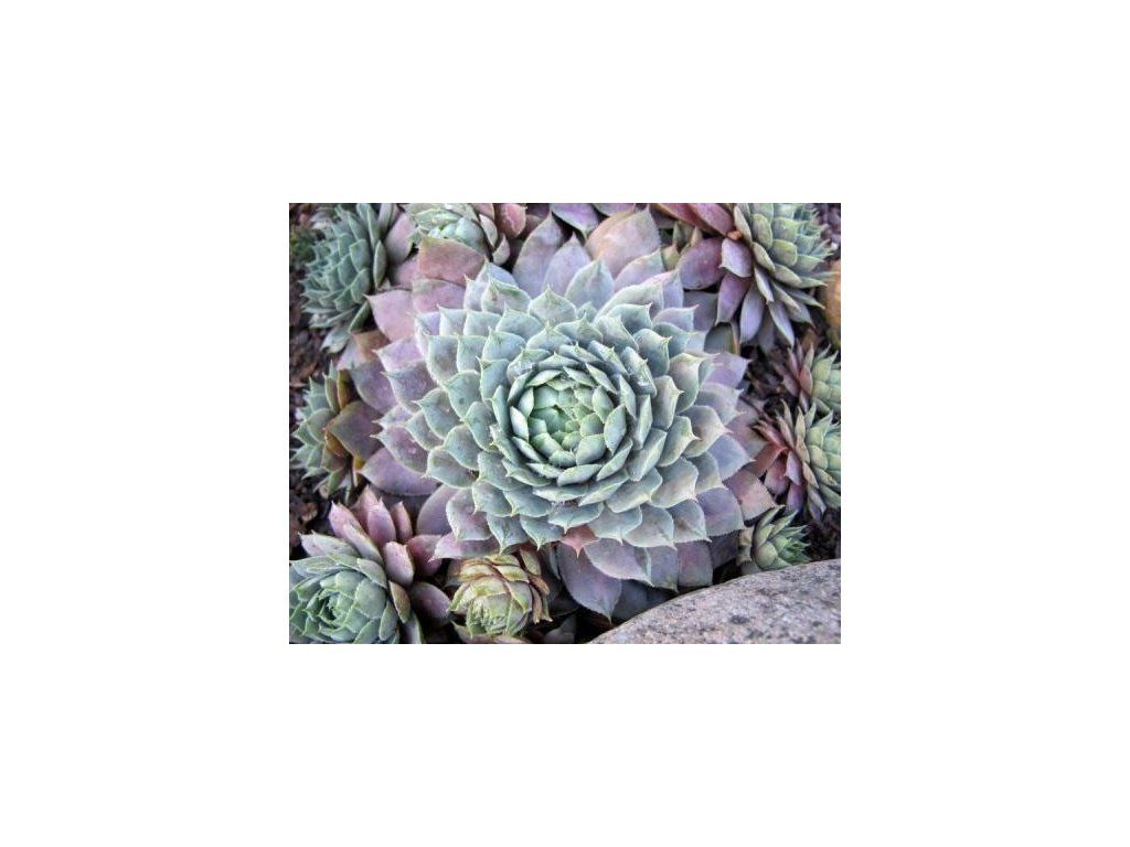 Hauswurz 'Lilac Time' - sukkulente Staude, die attraktive, immergrüne Rosetten bildet. Wird 2 - 8 cm hoch und 15 - 20 cm breit. Dicht stehende Blätter sind fleischig, saftig, blau-silber-grün mit roten Spitzen. Im Laufe des Sommers wächst aus der Mutterrosette ein kräftiger Stiel mit ausgeprägten rosa Blüten. Diese Rosette stirbt nach der Blüte ab, wird aber sofort durch zahlreiche weitere ersetzt.
