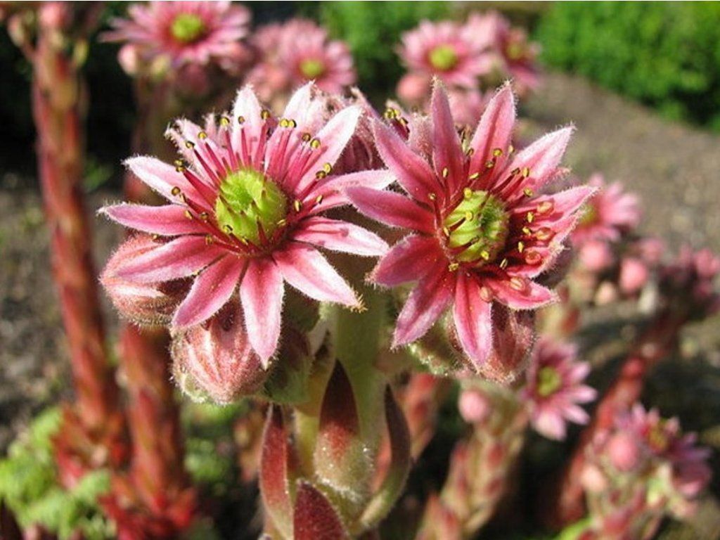 Sempervivum x hybridum (Hauswurz) – eine grosse Gruppe von Steingartenpflanzen, meist von geringem Wuchs, Rosettengrösse ca. 10cm. Ausgezeichnet für die Pflanzung auf Steinmauern, in Steingärten, zur Begrünung von Hausdächern usw. Wir pflanzen ihn in trockenere Böden, die nicht zu nährstoffreich sind und eine gute Drainage aufweisen. Er liebt volle Sonne und verträgt auch pralle Sonne. Halbschatten macht ihm auch nichts aus, beeinflusst aber die Intensität der Färbung. Winterhart. Blüht im Juli und August.