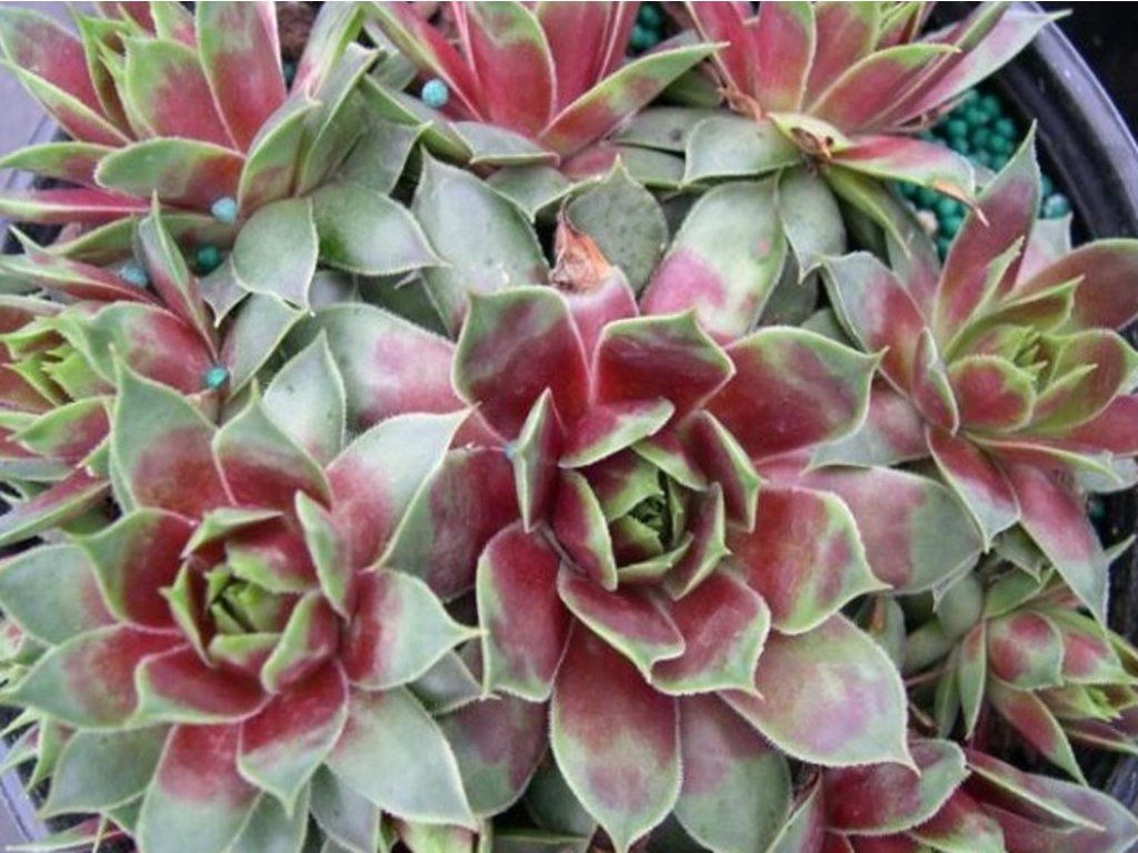 Hauswurz hybr 'Red King' – eine große Gruppe von Sukkulenten, meist niedrig wachsend, Rosettengröße ca. 10 cm. Ausgezeichnet für die Pflanzung auf Steinmauern, in Steingärten, zur Begrünung von Hausdächern usw. Wir pflanzen ihn in trockenere Böden, die nicht zu nährstoffreich sind und eine gute Drainage aufweisen. Er liebt volle Sonne und verträgt auch pralle Sonne. Halbschatten macht ihm auch nichts aus, beeinflusst aber die Intensität der Färbung. Winterhart. Blüht im Juli und August.