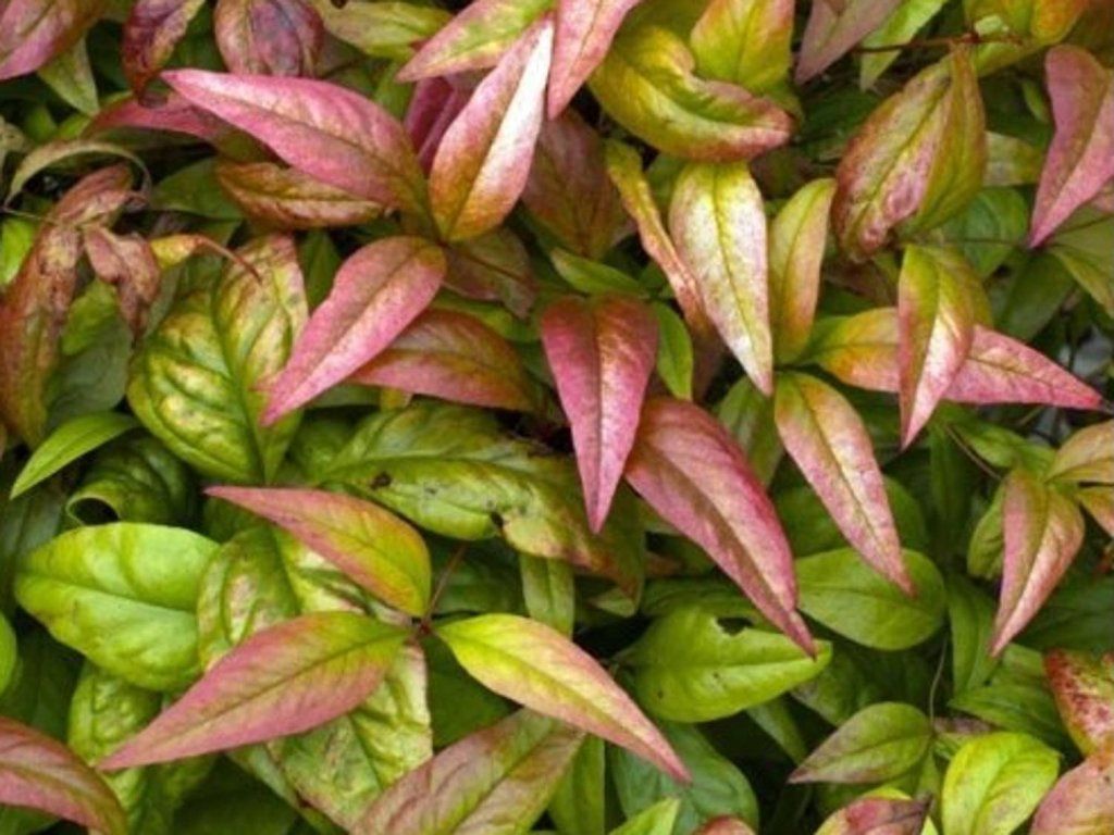 Nandina domestica 'Compacta' - breitblättriger, immergrüner, kompakter Strauch, der eine Höhe und Breite von etwa 1,2-1,5 m erreicht. Das Wachstum ist aufrecht. Ende des Frühlings bildet er Büschel kleiner, weißer Blüten, die im Herbst durch winzige rote Beeren ersetzt werden. Am interessantesten ist jedoch das mehrfarbige Laub in den Farbtönen Grün, Gelb, Rot und Weinrot.