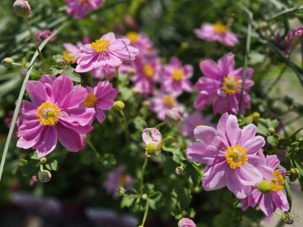 Anemone hupehensis 'Little Breeze Sweet' - eine kompakte Herbst-Anemone, die etwa 35 cm hoch wird und sich somit ideal für kleinere Beete oder die Kübelbepflanzung eignet. Sie bildet einen dichten Horst dunkelgrüner Blätter, über dem sich von August bis Oktober einfache Blüten in einem zartrosa Farbton mit einer ausgeprägten gelben Mitte zeigen. Die Blüten sind schalenförmig und erzeugen durch ihre Größe und satte Farbe einen durchgehenden Farbeffekt auf dem Horst, der frisch und elegant wirkt. Die Pflanze ist vollkommen winterhart. Dank ihres kompakten Wuchses und der üppigen Blüte eignet sie sich für Beete und Kübel, wo sie dem Garten einen späten Sommer- und Herbstfarbakzent verleiht.