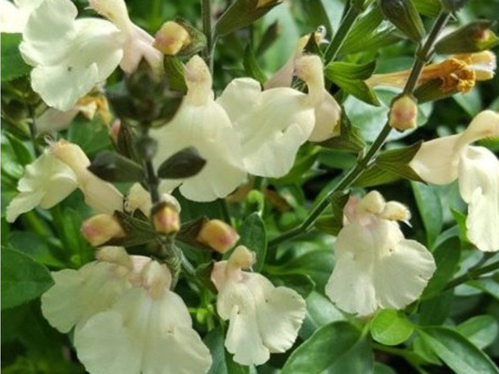 Salvia greggii Mirage 'Cream' - Zier-Salbei, der bis zu 40 cm hoch wird. Eine Staude, die sich für gemischte Staudenbeete eignet. Eine Gruppe mehrerer Pflanzen erzeugt einen auffälligen Farbeffekt. Gedeiht an einem sonnigen Standort in durchlässigem, lehmig-sandigem Gartenboden. Frosthart. Die Sorte Cream hat vanille-cremefarbene Blüten, die sehr schön und elegant sind. Ihre Blätter sind mittelgrün. Blüht von Juni bis September.
