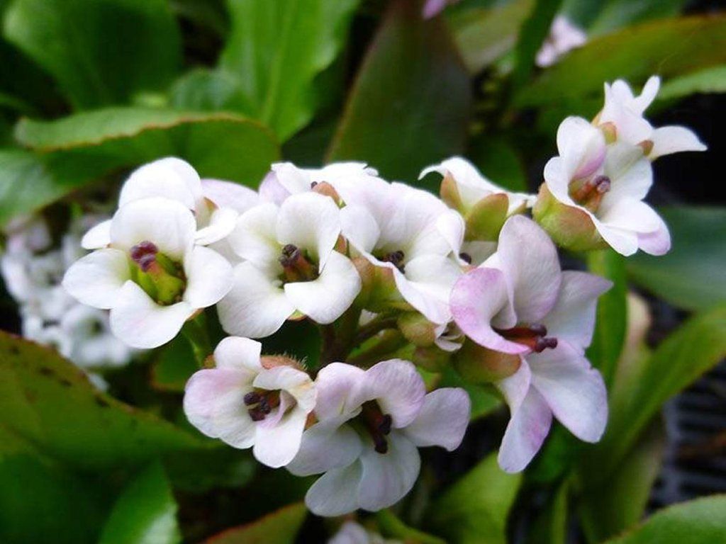 Herzblättrige Bergenie 'Breissingham White' - eine weitere schöne Sorte dieser Reihe. Eine Staude aus der Familie der Steinbrechgewächse, ursprünglich aus den kälteren Regionen Sibiriens und des angrenzenden Zentralasiens. In der Natur wächst sie an Waldrändern, in lichten Gebüschen und an steinigen Hängen, wo der Boden nach Regen feucht, aber schnell entwässert ist. Die Sorte ‘Bressingham White’ wurde in den Bressingham Nurseries in Norfolk eingeführt und wird mit der Zuchtarbeit von Adrian Bloom in Verbindung gebracht. Sie bildet einen langlebigen, niedrigen Horst mit glänzenden, ledrigen Blättern von 15–20 cm, die rundlich bis herzförmig sind. Das Laub bleibt über den Winter erhalten und färbt sich bei Kälte oft bronzefarben bis weinrot. Eine ausgewachsene Pflanze erreicht eine Blütenhöhe von etwa 30–40 cm und eine Breite von 45–60 cm. Von Ende März, häufiger im April und Mai, trägt sie auf kräftigen Stielen glockenförmige Blütenrispen von 1,5–2,5 cm, die sich zart rosa öffnen und in einen weißen Ton übergehen. Die Blüten bieten eine frühe Quelle für Nektar und Pollen für Bienen und Hummeln, die Stiele eignen sich auch zum Schnitt. In der Komposition eignet sie sich als Wegbegrenzung, Füllung unter lichten Gehölzen und für Beete mit Funkien, Farnen und Purpurglöckchen, wo sie eine ruhige, ganzjährige Struktur bietet. Nach der Blüte bilden sich Samenkapseln, aber der dekorative Effekt wird hauptsächlich durch die Blattrosette erzielt, die den Boden bedeckt und die Unkrautbildung unterdrückt. Die Sorte wird zu den Trägern der Auszeichnung RHS Award of Garden Merit gezählt.