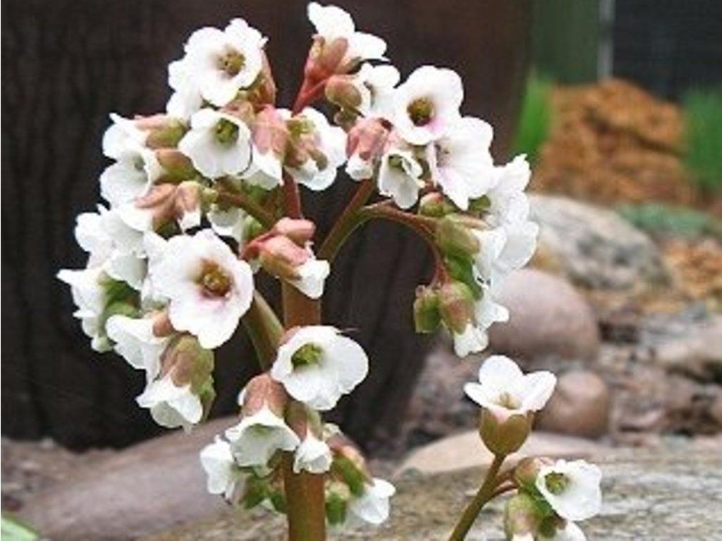 Bergenia cordifolia 'Silberlicht' - beliebte Bodendecker- oder Randstaude. Sie wird 25 bis 60 cm hoch. Die Blüte ist wunderschön weiß-rosa und wirkt zusammen mit den grünen Blättern sehr ansprechend. Blüht von März bis April. Pflanzung im Halbschatten.