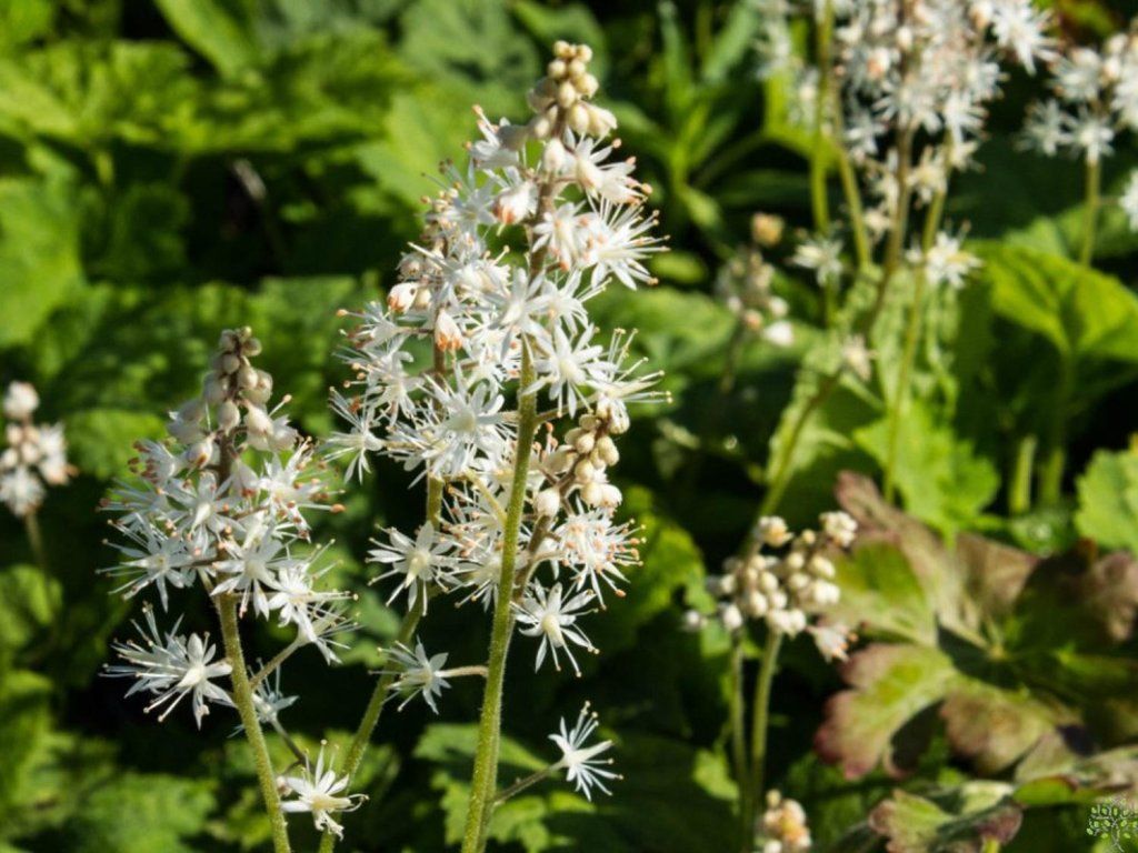 Tiarella cordifolia - eine ausdauernde krautige Pflanze aus der Familie der Steinbrechgewächse, die ursprünglich aus dem östlichen Teil Nordamerikas stammt und dort natürlicherweise in Laubwäldern, an feuchten Waldrändern und in humosen, organisch reichen Böden wächst. Die Art zeichnet sich durch einen niedrigen, ausgebreiteten Habitus und die Fähigkeit aus, durch kurze Ausläufer dichte Bestände zu bilden. Im ausgewachsenen Zustand erreicht sie eine Höhe und Breite von etwa 20-30 cm bzw. 30-40 cm. Die Blätter sind herzförmig bis gelappt, frischgrün, oft mit feiner Zeichnung entlang der Blattadern, im Herbst können sie bronzene bis rötliche Töne annehmen. Die Blüten sind klein, weiß bis cremeweiß, angeordnet in schmalen, luftigen Trauben von etwa 10-15 cm Höhe. Die Blütezeit findet in der Regel von April bis Mai statt und bringt einen zarten Frühlingsakzent in schattige Gartenbereiche. Die Pflanze ist weder essbar noch heilkräftig. In Gartengestaltungen wird sie hauptsächlich als Bodendecker-Staude unter Bäumen und Sträuchern, in Waldgärten und in Verbindung mit Farnen, Frühlingszwiebelblumen, Funkien oder Purpurglöckchen eingesetzt.