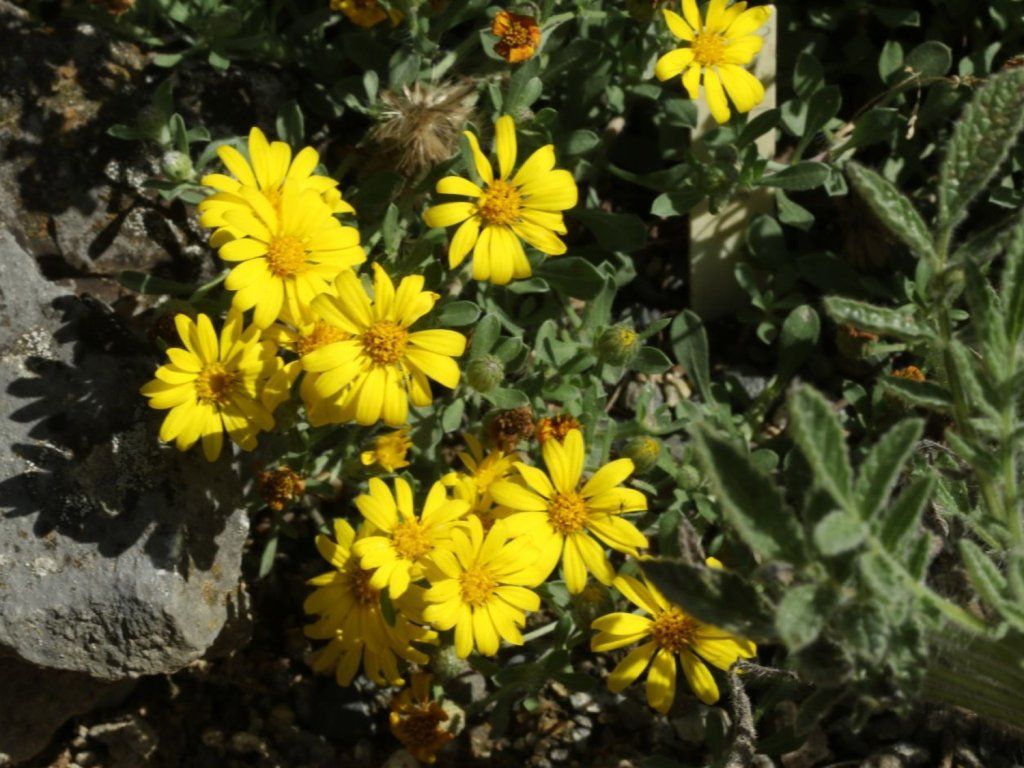 Heterotheca jonesii - eine kleine Steingartenpflanze aus der Familie der Korbblütler, ursprünglich aus dem Südwesten der USA, insbesondere aus Utah, wo sie trockene, felsige Hochebenen und Felsspalten besiedelt. In der Natur wächst sie auf mineralischen, oft kalkhaltigen Böden mit schneller Wasserableitung und großen Temperaturschwankungen zwischen Tag und Nacht. Im Garten bildet sie einen dichten, polsterartigen Bewuchs aus kurzen Trieben und schmalen, grau filzigen Blättern, die silbrig wirken und auch außerhalb der Blütezeit Struktur verleihen. Das Wachstum bleibt sehr gering, normalerweise etwa 2–5 cm, was auch für Mauerritzen und Stellen geeignet ist, an denen sie nicht stören darf. Während des Sommers bis Herbstes, meist von Juni bis Oktober, erscheinen über den Blättern einzelne gelbe Blütenkörbchen, in der Regel 1–2 cm breit, mit strahlenförmigen Blüten. Die Blüten duften nicht auffällig, bieten aber Pollen für kleine Bestäuber und wirken im Steingarten wie warmes Licht auf silbrigem Grund. Lange Blütezeit und graues Laub bilden eine natürliche Brücke zwischen den Frühlings-Steingartenarten und dem Spätsommer. In Kompositionen lässt sie sich gut mit Steinbrech, Polsterphlox, Blaukissen, niedrigen Sedum-Arten oder kleinen Gräsern kombinieren, wo sich die matte Silberoberfläche und der Glanz des Schotters abwechseln. Sie eignet sich auch für Sammlertröge und Alpinumschalen, wo das Blattdetail zur Geltung kommt.