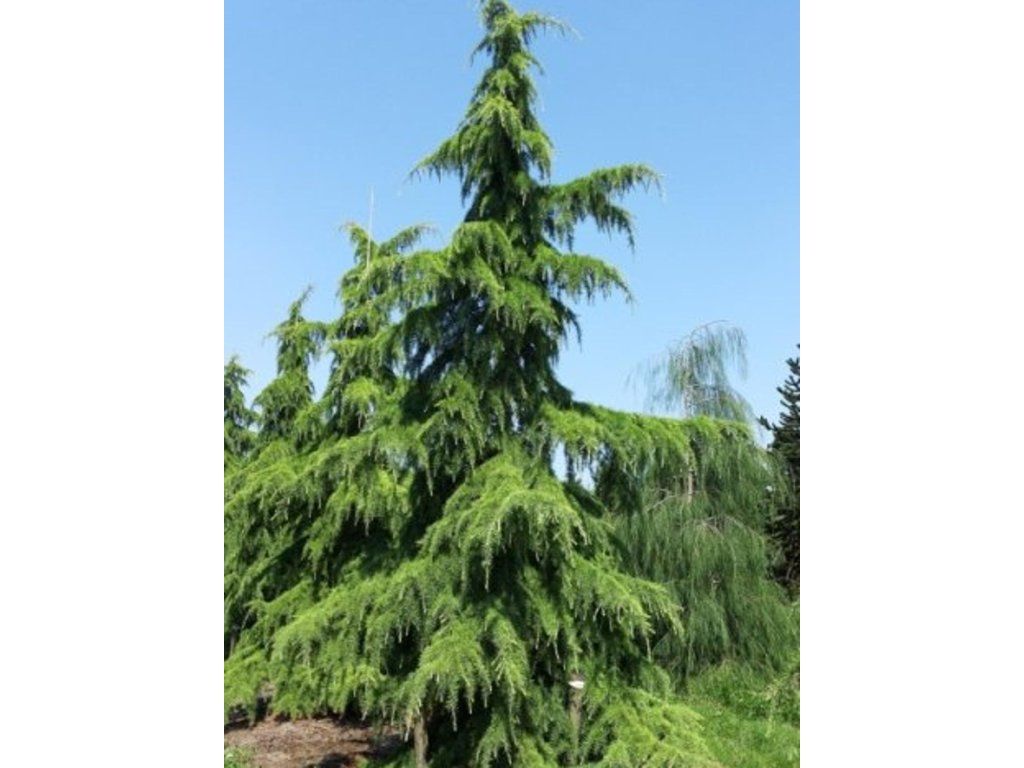 Himalaya-Zeder - majestätischer immergrüner Nadelbaum aus der Familie der Pinaceae mit einer ausgeprägten pyramidenförmigen, später breit kegelförmigen Gestalt. Der ausgewachsene Baum erreicht eine Höhe von 20–30 m und eine Breite von 8–12 m, wobei die jährlichen Zuwächse moderat sind. Die Nadeln sind weich, nadelgrün, 3–5 cm lang, leicht silbrig glänzend und bieten eine feine Textur sowie einen ausgeprägten visuellen Kontrast. Die Blüten sind einhäusig, männliche Kätzchen erscheinen im oberen Teil des Baumes und weibliche Zapfen reifen zu zylindrischen braunen Zapfen von 7–13 cm Länge heran. Er wächst langsam und ist resistent gegen die meisten Krankheiten und Fröste bis etwa −20 °C. Er eignet sich als Solitär zur Schaffung eines dominanten Elements im Garten oder Park, wo seine feine Nadelstruktur, seine elegante kegelförmige Gestalt und sein silbriger Glanz zur Geltung kommen. Er kann auch in Gruppen gepflanzt werden, wo er eine dauerhafte grüne Kulisse bietet, die das ganze Jahr über visuell attraktiv bleibt, seine Äste spenden Schatten und bieten Struktur für kleinere Zierpflanzen unter der Krone. Wenn Sie einen Nadelbaum suchen, der auf den ersten Blick beeindruckt, dann ist die Himalaya-Zeder die richtige Wahl.