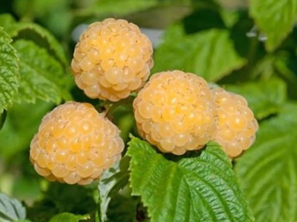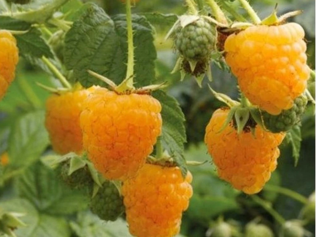 Himbeere 'Fall Gold' - eine gelbfruchtige, remontierende Himbeersorte mit kompaktem, aufrechtem Wuchs, die eine Höhe von bis zu 2 m erreicht. Die Ruten haben weniger Dornen als üblich. Die Früchte sind mittelgroß, gelb, süß und aromatisch. Sie reifen auf zweijährigem Holz im Juli und an jungen Trieben laufend im September, was eine verlängerte Ernte ermöglicht. Der Strauch ist mäßig wüchsig, es wird empfohlen, ihn an einer Stütze zu führen. Die Sorte ist frostbeständig bis -29 °C, ebenso ist die Widerstandsfähigkeit gegen Wurzelerkrankungen hoch. Sie ist für Gärten und kleinere Anbauflächen geeignet. Sie wird für ihre zuverlässige Ernte, farblich attraktiven Früchte, die für den direkten Verzehr, zum Einfrieren und zur Verarbeitung zu Hause geeignet sind, geschätzt.