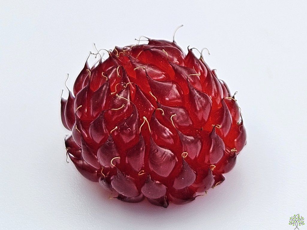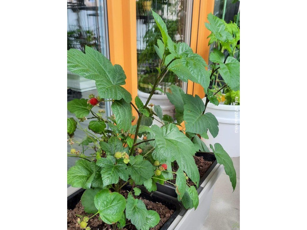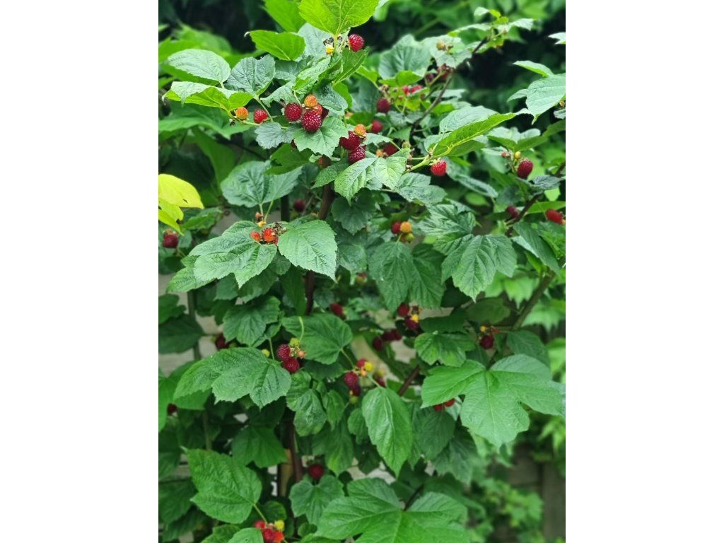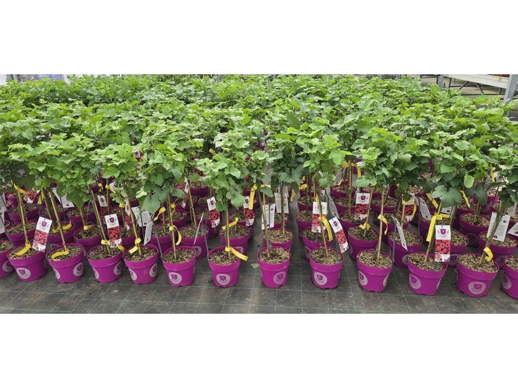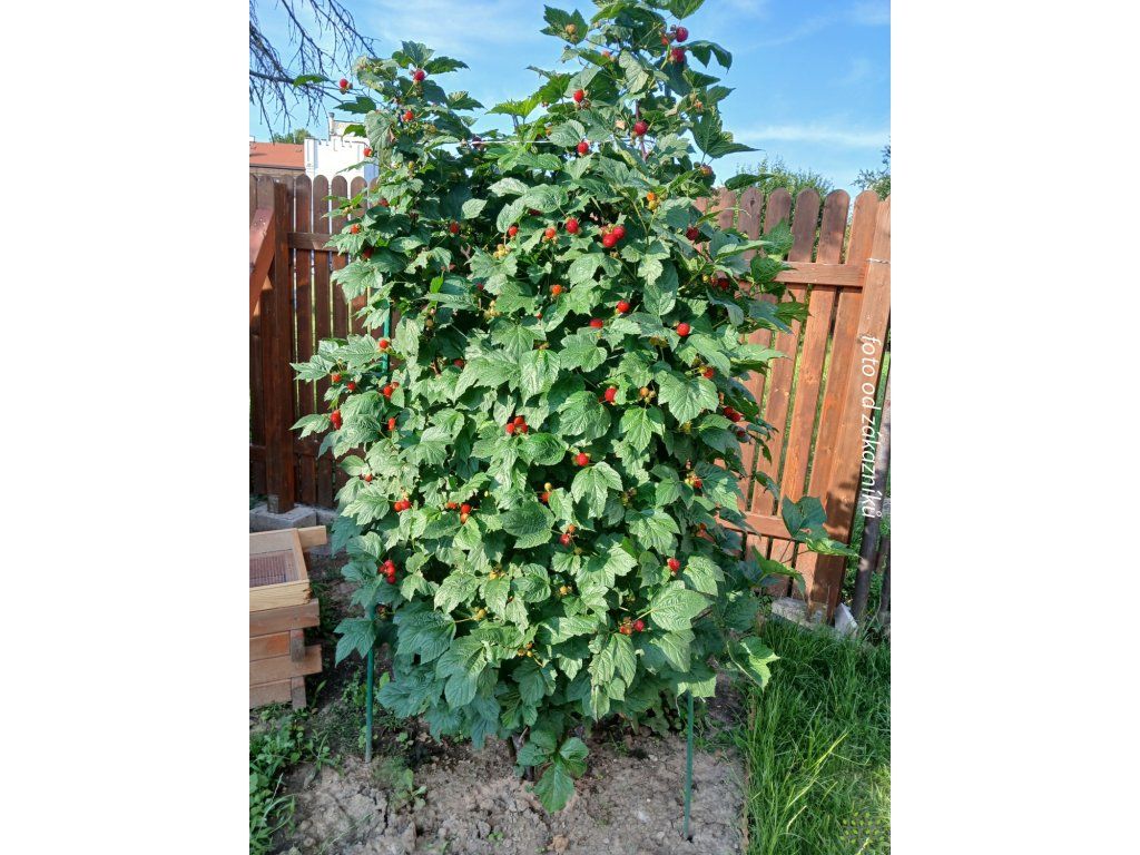 Himbeere 'Raspberry Tower' PBR - eine moderne säulenförmige Himbeersorte, die sich durch ein natürlich aufrechtes, schmales Wachstum ohne Stammbildung auszeichnet, sodass es sich nicht um einen Baum, sondern um einen kompakten Strauch mit festen, vertikal ausgerichteten Trieben handelt. Sie tragen jedes Jahr eine große Menge schmackhafter Früchte, die glänzend, tiefrot, etwa 2 cm groß, süß, saftig und angenehm aromatisch sind. Die Fruchtbildung konzentriert sich auf den Zeitraum von Juni bis August, in dem sie eine reiche und regelmäßige Ernte liefert. Das Wachstum ist kräftig, nach zwei Jahren erreicht die Pflanze normalerweise eine Höhe von etwa 120 cm und eine Breite von etwa 60 cm. Die Triebe haben kleine Dornen und wachsen gerade nach oben, was zu einem sehr kompakten Habitus führt, der keine Stütze oder komplizierte Formgebung erfordert. Dank ihres Wachstums ist diese Sorte außergewöhnlich gut für den Anbau in Behältern auf Balkonen, Terrassen oder in kleineren Gärten geeignet. Die Pflanze ist bis −25 °C frostbeständig und freut sich im Frühjahr über einen leichten Rückschnitt, der die Vitalität und die Bildung von fruchttragenden Trieben fördert. In der ersten Vegetationsperiode investiert sie die meiste Energie in die Entwicklung des Wurzelsystems, daher bildet sich der oberirdische Teil allmählich und das volle Wachstum und die Fruchtbildung zeigen sich erst in den folgenden Jahren.