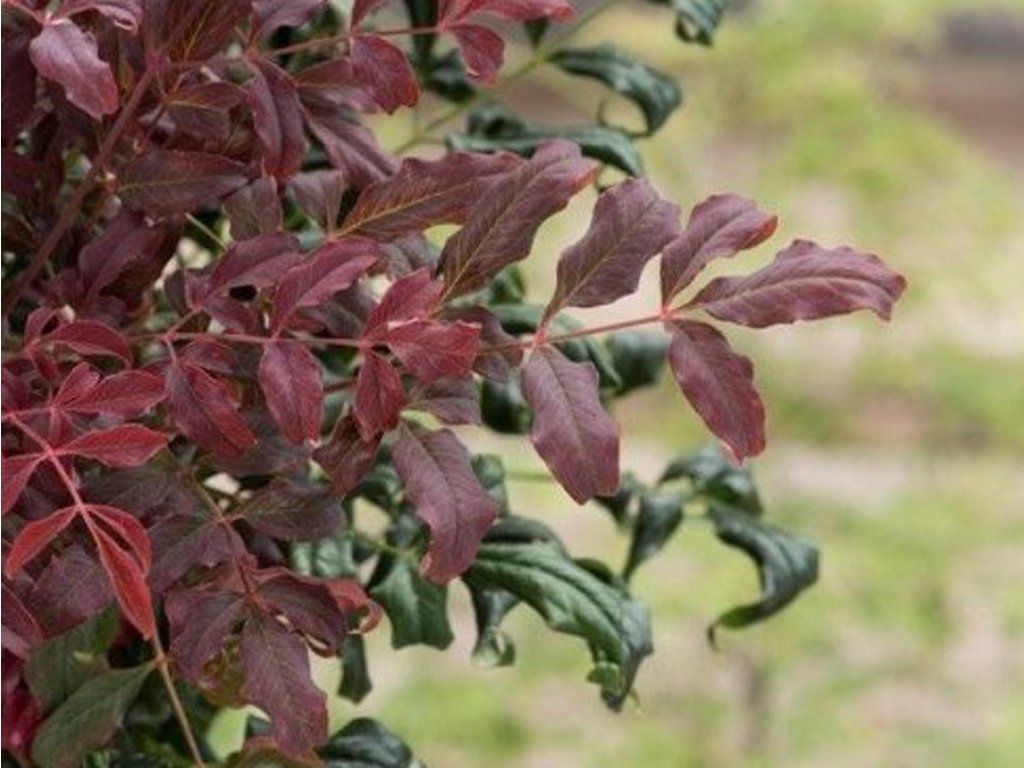 Nandina domestica 'Curly Obsessed' - kleiner, immergrüner Strauch, der eine Höhe von 0,6 m und eine Breite von 0,5 m erreicht. Optisch ähnelt er stark dem üblichen Kultivar Obssesed; der Unterschied liegt jedoch in den gedrehten Blättern. Diese haben als junge Triebe eine intensive rot-violette Farbe, die später zu einem dunklen Grün wechselt. Voll frostbeständig bis -18°C.
