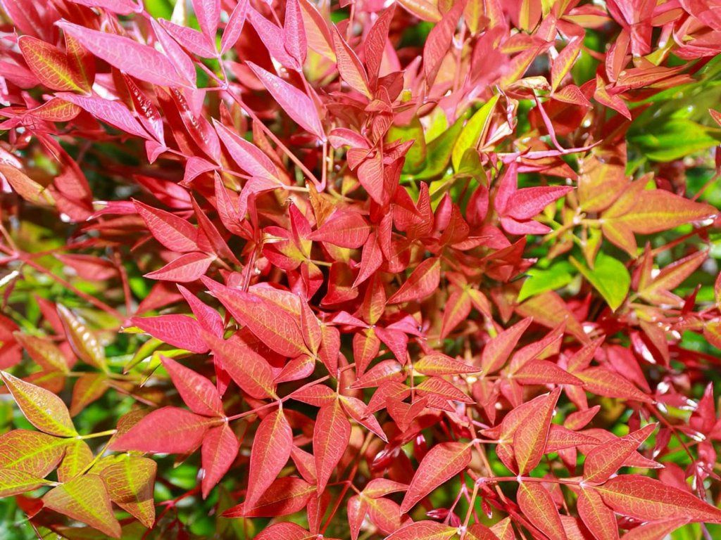 Nandina domestica 'Obsessed' - ein kompakter Strauch aus Asien, der wegen seines ganzjährigen visuellen Nutzens dank wechselnder Blattfärbung, Blüten und Früchten angebaut wird. Es handelt sich um einen kompakten, immergrünen Strauch mit einem dichten, aufrechten und dennoch zarten Habitus, der normalerweise 0,6–1 m hoch und 0,5–1 m breit wird, was ihn für kleinere Gärten, Hänge, Beetränder und die Kübelbepflanzung geeignet macht. Neue Triebe erscheinen im Frühjahr, sind feuerrot bis kupferfarben, gehen allmählich in Grün über und nehmen im Herbst und Winter intensive rote bis orangefarbene Töne an, wodurch das ganze Jahr über eine attraktive Farbigkeit geboten wird. Im Sommer, normalerweise von Juni bis August, bildet sie kleine weiße Blüten, die in kegelförmigen Rispen angeordnet sind und den ganzjährigen Zierwert der Pflanze ergänzen. Nach der Blüte erscheinen oft glänzende rote Beeren, die bis zum späten Winter an den Zweigen bleiben und den saisonalen Farbeffekt ergänzen. Die Früchte und Blätter enthalten giftige Stoffe und sind nicht zum Verzehr bestimmt. Pflegeleichtigkeit und relative Frostbeständigkeit fördern ihre Akzeptanz in deutschen Gärten.