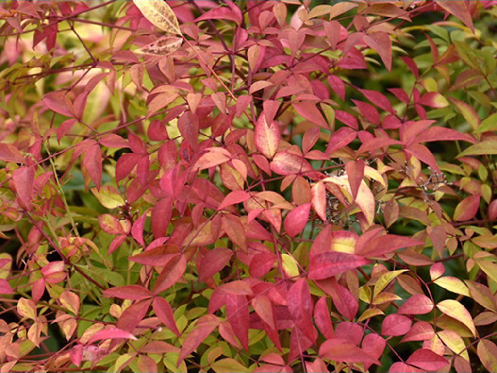 Nandina domestica 'Sienna Sunrise' – eine attraktive Sorte, die sich durch ihr auffällig gefärbtes Laub auszeichnet. Junge Triebe treiben in hellroten bis orangen Farbtönen aus, im Sommer färben sich die Blätter grün und im Herbst und Winter nehmen sie einen ausgeprägten scharlachroten Ton an, sodass der Strauch das ganze Jahr über dekorativ bleibt. Sie erreicht in der Regel eine Höhe von etwa 1–1,2 Metern und hat einen kompakten, aufrechten, aber dennoch leicht luftigen Wuchs. Anfang Sommer erscheinen kleine weiße Blüten in Rispen, die anschließend durch dekorative rote Beeren ersetzt werden können, die bis in den Winter hinein erhalten bleiben. Dank ihres sich verändernden Laubes und ihres kompakten Wuchses eignet sie sich für gemischte Pflanzungen, zur Belebung von Heidegärten, als Solitärstrauch oder für Kübel auf Terrassen.