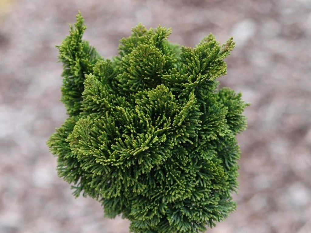 Scheinzypresse 'Hage' - gehört zu den Zwergkultivaren der Scheinzypresse, einem immergrünen Nadelbaum aus der Familie der Zypressengewächse. Die Ursprungsart wächst in Japan in Bergwäldern oft über 700 m ü. d. M., wo sie kühlere Sommer, feuchtere Luft und tiefere, humose Böden hat. Charakteristisch für die Hinoki-Zypresse sind abgeflachte Verzweigungen und schuppenförmige Nadeln, die fächerartig angeordnet sind und eine ausgeprägte, fast „gewebte“ Textur erzeugen. Der Kultivar ‚Hage‘ bildet einen unregelmäßig kissenförmigen bis niedrig kegelförmigen Strauch mit sehr langsamem Wachstum. Langfristig überschreitet er normalerweise nicht etwa 1 m Höhe, unter guten Bedingungen breitet er sich in der Breite von etwa 1–1,2 m aus. Das Laub ist dunkelgrün, kann im Winter vorübergehend leicht bräunen und wird im Frühling wieder grün. Von März bis April erscheinen kleine Pollenzapfen, die Bestäubung erfolgt durch Wind, und im Herbst reifen runde Zapfen von 10–12 mm. Der Zierwert liegt hauptsächlich im immergrünen Volumen und dem feinen Astrhythmus, der Heidekraut, Rhododendren, japanische Ahorne und Steingärten gut ergänzt. In der Nähe von Wasserelementen oder im Halbschatten höherer Gehölze wirkt er natürlich und leidet gleichzeitig nicht unter sommerlicher Überhitzung. Dank seines langsamen und geringen Wachstums ist er ideal für die Kultur in Gefäßen.