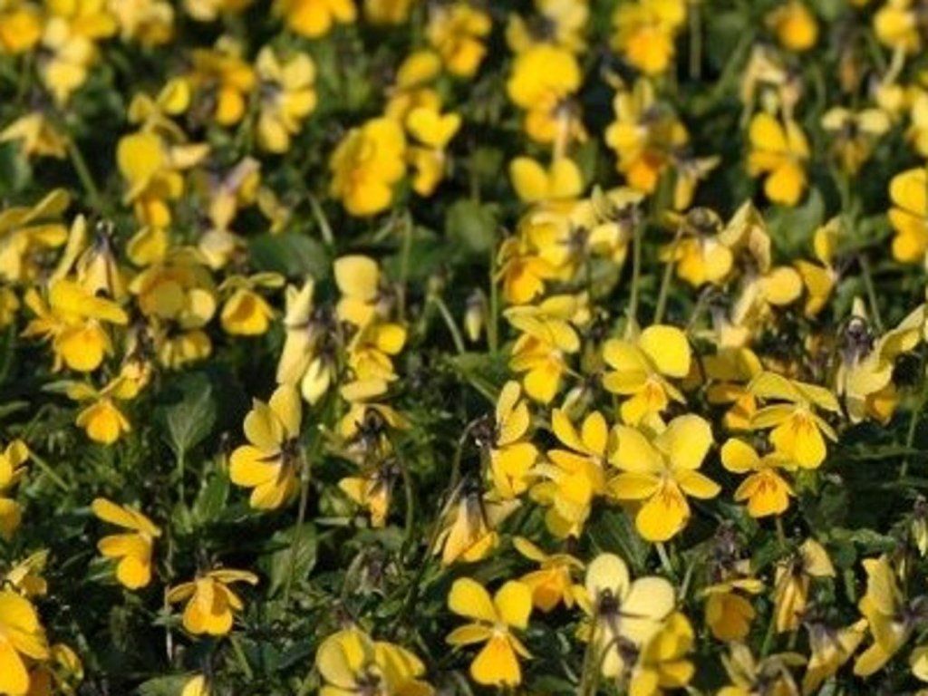 Hornveilchen 'Baby Franjo' - Eine widerstandsfähige, mehrjährige Staude mit attraktiven Blüten. Wächst bis zu einer Höhe von 10-12 cm und einer Breite von 12-15 cm. Sie hat sehr dekorative gelbe Blüten und dunkelgrüne Blätter. Ideal für Steingartenanlagen, an Wegrändern oder als Unterpflanzung unter Bäumen.