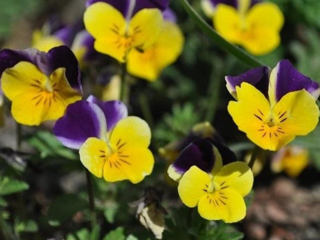 Violetter Steinsame 'Helen Mount' - Dreifarbige Staude, die anspruchslos im Anbau ist. Sie hat Blüten in Gelb, Violett und Zartrosa. Die Nadeln sind dunkelgrün. Sie erreicht eine Höhe von 10-15 cm und eine Breite von 15-20 cm. Blüht von Juni bis September. Die Blüten werden auch in der Küche verwendet. Im Juni können wir die Blüte durch einen leichten Rückschnitt fördern. Ideal für Steingartenanlagen, an Wegrändern oder als Unterpflanzung unter Bäumen.