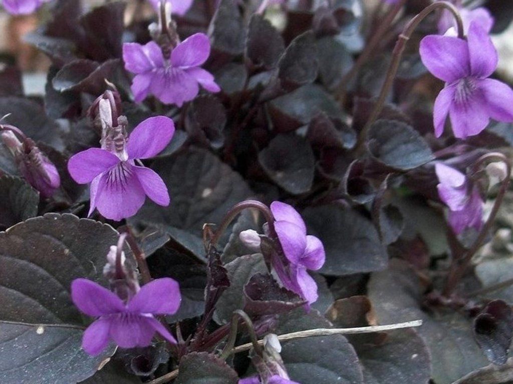 Gefüllte Veilchen 'Purpurea' - eine niedrige, ausdauernde krautige Pflanze aus dem nordöstlichen Nordamerika, wo die Art natürlich in kälteren Regionen von Laub- und Mischwäldern, auf feuchteren Wiesen und im Unterholz von Gehölzen vorkommt. Die Sorte 'Purpurea' unterscheidet sich von der botanischen Art hauptsächlich durch ihr ausgeprägtes Blattwerk, das im Frühling und Herbst einen tiefen purpurnen bis weinroten Farbton aufweist und im Sommer teilweise in ein dunkelgrün mit bronzefarbenem Einschlag übergehen kann. Die Pflanze bildet niedrige, kompakte Horste mit einer grundständigen Rosette aus eiförmigen bis herzförmigen Blättern und erreicht eine Höhe von etwa 8-12 cm, bei allmählicher Ausbreitung eine Breite von etwa 20-25 cm. Die Blüten sind klein, fünfzählig, violett bis blauviolett, erscheinen im frühen Frühling, meist im April und Mai, und bilden einen feinen Kontrast zum dunklen Blattgrund. Sie sind nicht stark duftend, stellen aber dennoch eine frühe Nahrungsquelle für bestäubende Insekten dar. Dank ihres ruhigen Wachstums und ihrer Fähigkeit, dichte, aber nicht zu expansive Bestände zu bilden, wird Viola labradorica 'Purpurea' hauptsächlich als Bodendecker-Staude in halbschattigen und schattigen Gartenbereichen eingesetzt, wo sie auch außerhalb der Hauptblütezeit für farbliche Struktur sorgt. In Kompositionen lässt sie sich gut mit Farnen, Lungenkräutern, Bergenien, Immergrün oder Frühlingszwiebelblumen kombinieren, deren Blüten die dunklen Blätter deutlich hervorheben.