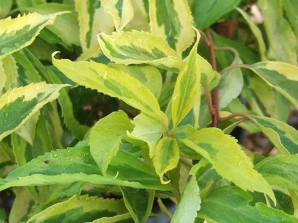 Forsythia intermedia 'Golden Times' - ein laubabwerfender Strauch mit aufrechtem Wuchs. Im ausgewachsenen Zustand erreicht er eine Höhe von ca. 120 - 150 cm bei etwa gleicher Breite. Die Blätter sind gegenständig, lanzettlich, eiförmig, der Blattrand ist gesägt. Sie sind mittelgrün gefärbt, die Ränder sind in einem helleren Grünton mit einem Hauch von Creme panaschiert. Die Blüten sind leuchtend gelb, sehr auffällig und erscheinen Ende März/Anfang April. Sie ist pflegeleicht und verleiht jedem Garten ein interessantes und ansprechendes Aussehen.